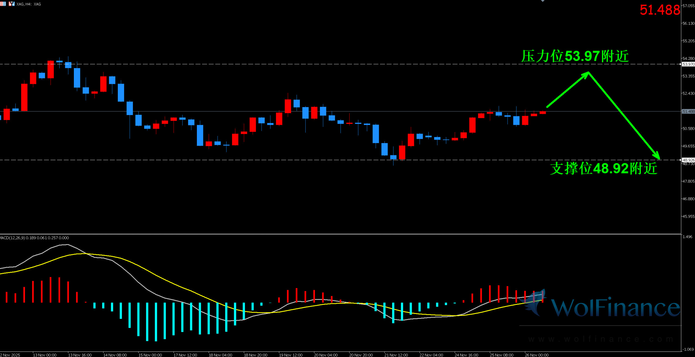 从日线图看,现货白银自40附近启动的上涨在54.4一带遇到明显抛压,随后回落并在45.5附近获得支撑,近期在47.8—53.3区间内反复震荡,目前价格50.30大致处于区间中部。MACD在零轴附近运行,DIFF与DEA此前死叉后逐步收敛,绿柱缩短,说明前期下行动能有所减弱,但多头优势尚不明显。RSI维持在50上方震荡,未进入明显超买或超卖区域,反映市场情绪偏中性。整体而言,当前更像是前期大涨后的整理消化阶段,上方54.3—54.4一带仍是重要阻力,下方45.5附近为阶段性支撑,后续价格向哪一侧有效突破,可能对中短期结构有较大影响。