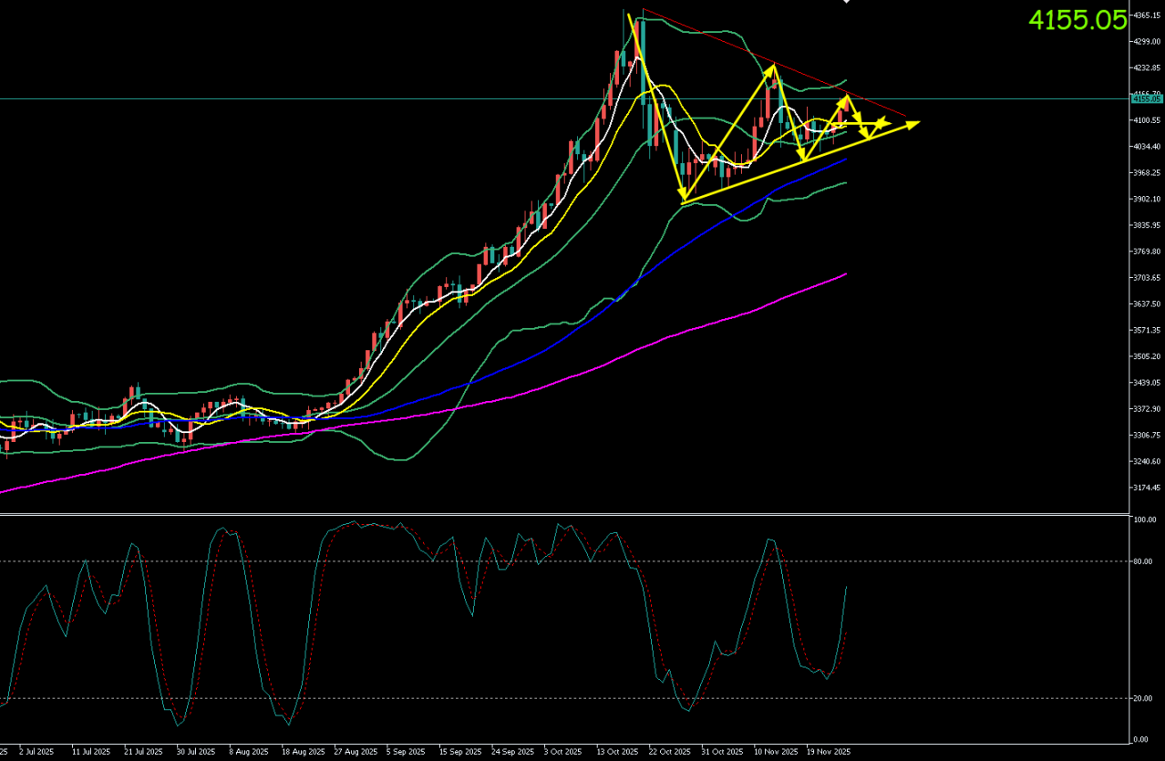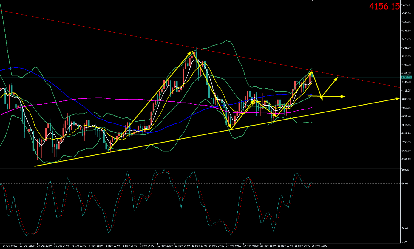 黄金周二(11.25)最高上探至4139.34美元/盎司,最低触及4159.18美元/盎司。收盘于4129.77美元/盎司,周三(11.26)开于4133.72元/盎司,截至目前最高上探至4155.89美元/盎司,最低触及4122.56美元/盎司,黄金小时线级别震荡上行,现报价4164.3