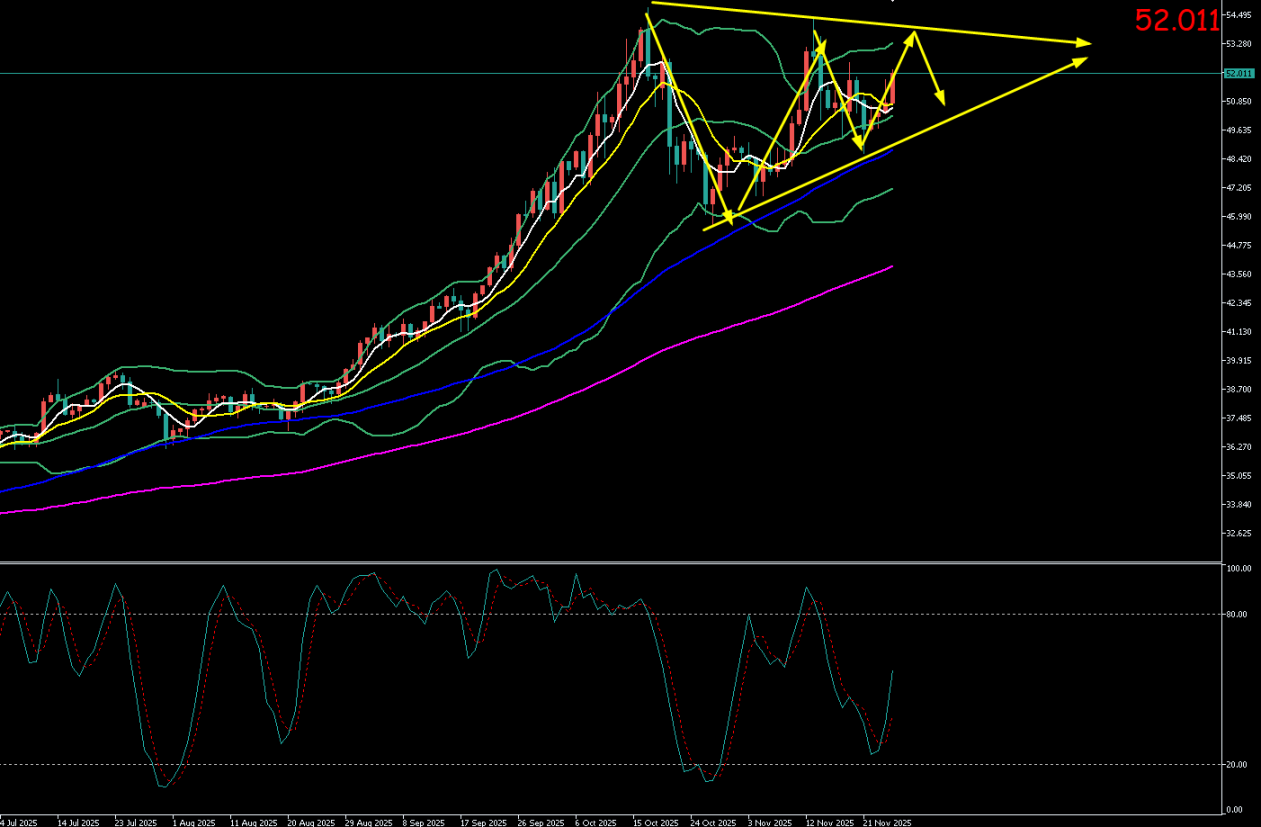 白银周二(11.25)最高试探51.76美元/盎司,最低触及50.67元/盎司。收盘于51.49美元/盎司。周三(11.26)开于51.48美元/盎司,截至目前最高上探至52.17元/盎司,最低试探至51.3,现报51.87元/盎司附近.