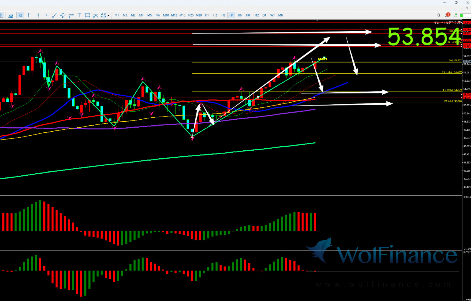解析:日线AO绿色,AC绿色,日线鳄鱼线缠绕;4小时AO绿色,AC绿色,鳄鱼线缠绕向上;银价创出新高目前至40.481附近,12H图上看目前银价走得是主三浪上涨走势中理论上方关注50.13-52.34目标预期;银价自12H的120均线两次企稳后再次上涨,4H自36.95低点涨至43.04后回调至60均线下方41.14后再次上涨至当下48.69,从浪形上看银价目前判定为4小时的5-5浪预期的上涨预期中,上涨的最低标准反转线为2小时的蓝色线的蓝色线和60均线之间,上周银价跌破2小时的60均线判定为5-4浪调整,银价冲击51.21后回落至2小时的蓝色线和60均线上方在48.38-51.21之间偏多震荡后再次涨至54.77后冲高回落且跌破了2小时的60均线和蓝色线至2小时的120均线附近后反弹,银价跌破了2小时的60均线后打坏了上涨结构且1小时银价跌破120均线是故目前判定银价在1小时和30分钟上属于主跌浪,银价最低跌破2小时的356均线至12小时的89均线和8小时的14均线后反弹,15分钟上完成下跌完整的5-5浪结构后反弹,目前从45.54后反弹至47.54附近,这段上涨判定为15分钟的A浪反弹48.45高点后回落1小时的60均线后再次起涨至49.35-49.55压力后回落至1小时的60均线附近反弹未超过49.00-49.35压力后再次的下跌,银价跌破了1小时的120均线则判定1小时目前走着B浪下跌跌至A浪的50%-23.6%区间的支撑即47.44-46.94-46.34后反弹至30分钟的89-60均线之间,白银反弹站上1小时的120-89均线涨至1 小时的356均线附近后回落,2小时上银价回落判定为回调C-2浪,银价跌回1小时的120均线支撑后继续上涨,银价冲击至54.38后回落,回落至1小时的60均线后反弹至30分钟的60均线反弹至20分钟的120均线附近但承压于30分钟的60均线后再次下跌,上周五银价跌至目前跌破前低49.35至48.91-48.46支撑后反弹,目前银价再次上涨超过53.70涨至54.00,当下银价处在30分钟上涨同级别5-5-3中上方关注54.88-55.05-55.79-56.05-56.55目标预期后看调整预期下方关注30分钟的60-89-120-356均线支撑预期。