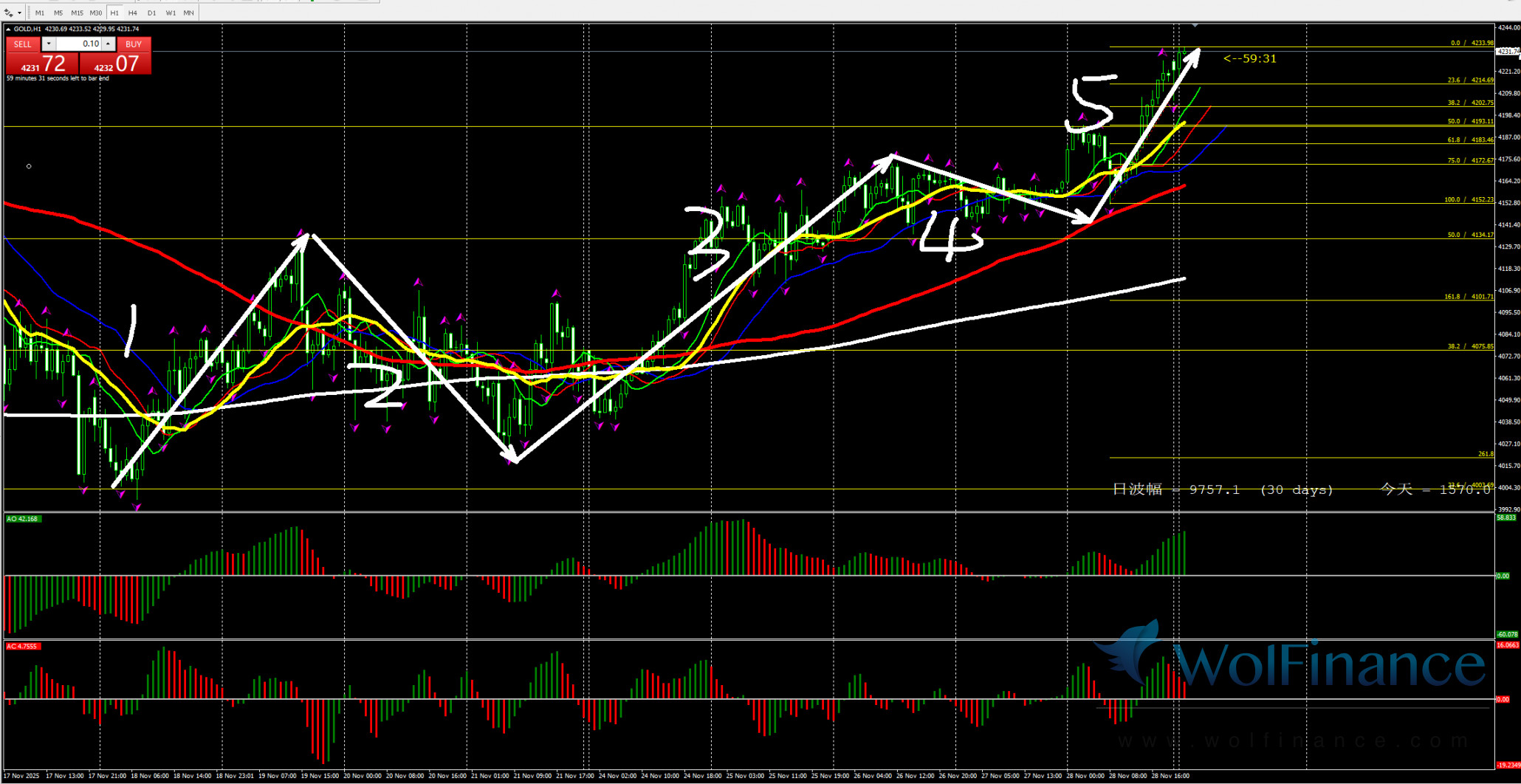 日线级别行情处于4浪行情,关注4浪行情走势,在日线图中关注压力倾向在日线图4260一线附近;支撑倾向在日线图50%(3845);61.8%(3719);四小时行情处于4浪状态,关注4浪的行情走势。支撑倾向在3930附近。1小时图AO零轴上绿色,AC零轴上红色,代表在小时图中,行情倾向隔夜小时图处在5浪行情,目前在小时图中关注5浪的行情走势,下方支撑3930附近。在1小时图中,行情上涨压力关注4260附近。