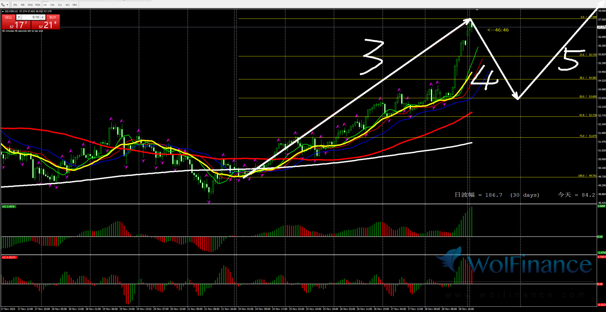 1、白银反弹关注58.10附近做空,止损:58.60;目标:57.60;57.10;56.50;