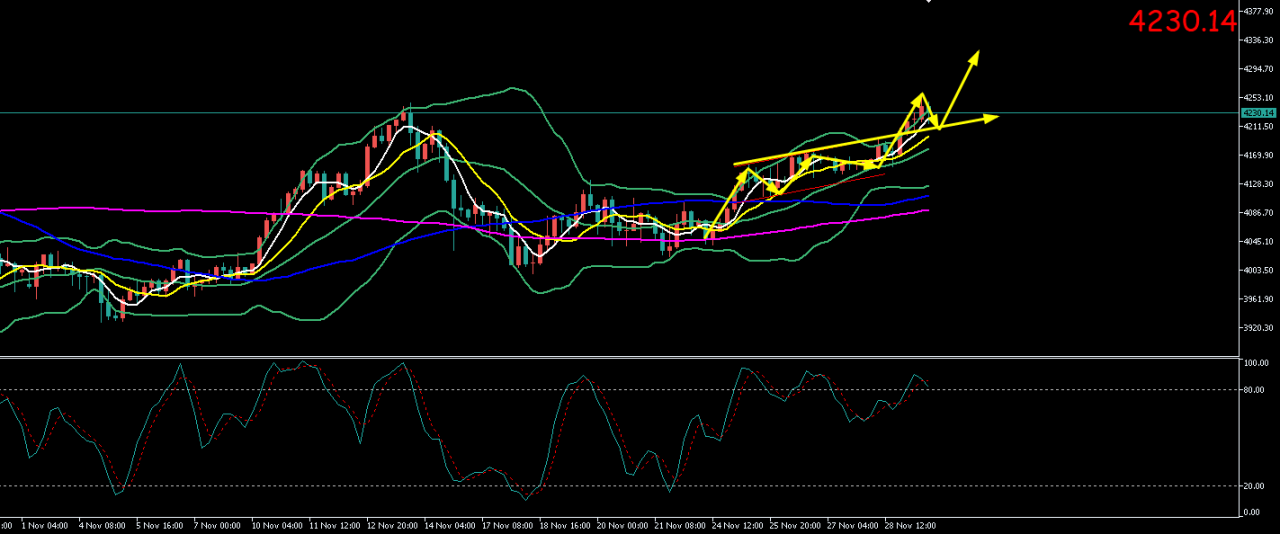 黄金周五(11.28)最高上探至4227.51美元/盎司,最低触及4152.16美元/盎司。收盘于4217.64美元/盎司,周一(12.1)开于4221.23元/盎司,截至目前最高上探至4256.21美元/盎司,最低触及4214.95美元/盎司,黄金小时线冲高回落,现报价4228.38基本面分析: