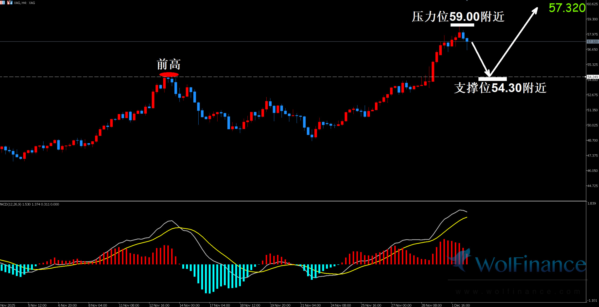 周二(12月02日)白银亚盘大幅冲高回落,等待支撑位多单布局。白银暴涨创纪录,年内涨幅超100%如果说黄金的上涨是稳健的,那么白银的表现则可以用“爆炸性”来形容。周一,白银价格大涨3.8%,收报每盎司58.57美元,盘中更是触及58.82美元的历史新高。今年以来,白银累计涨幅已超过100%,这在贵金属市场中实属罕见。白银的强势不仅得益于与黄金相似的宏观驱动因素,还源于其在工业领域的广泛应用,如电子产品和太阳能电池等。随着全球制造业复苏预期,白银的需求端也获得额外提振。