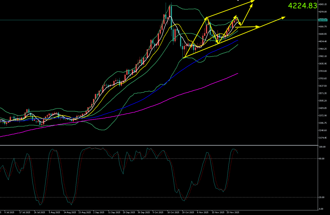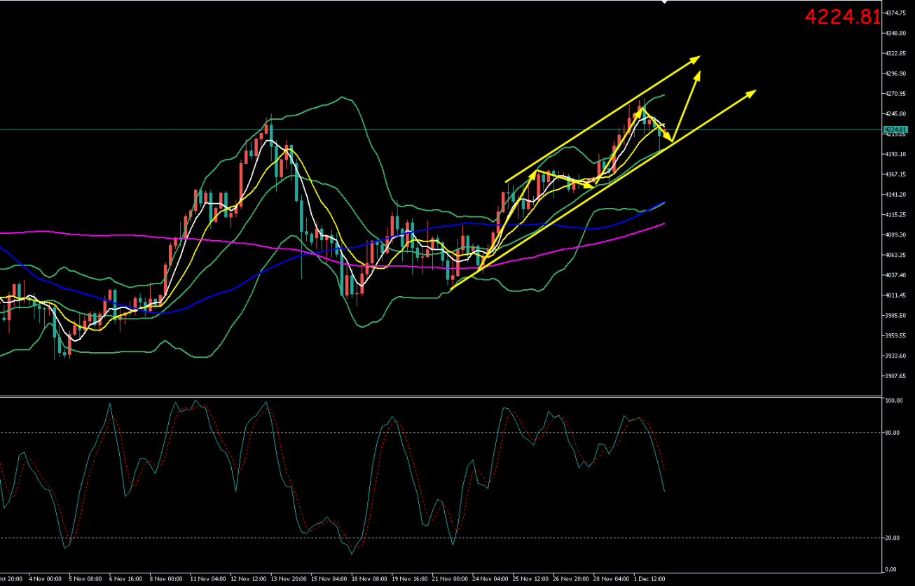 黄金周一(12.2)最高上探至4264.83美元/盎司,最低触及4204.79美元/盎司。收盘于4230.1美元/盎司,周二(12.3)开于4230.2元/盎司,截至目前最高上探至4245.04美元/盎司,最低触及4197.6美元/盎司,黄金小时线探底回升,现报价4221.15基本面分析: