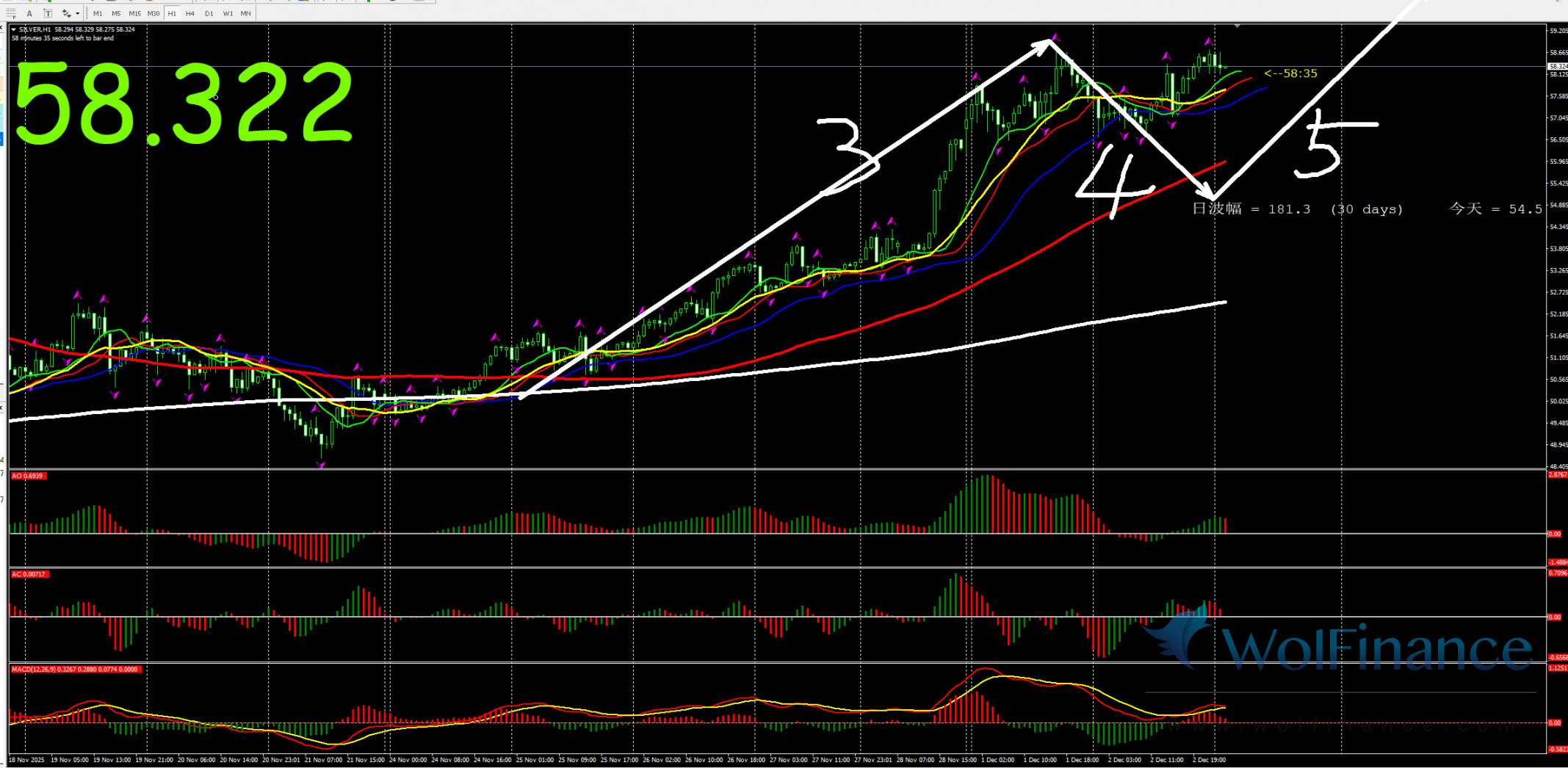 日线图目前处在5浪之中,关注5浪的行情走势。压力倾向在日线图60.00一线附近;支撑倾向在日线图50%(51.60)和61.8%(50.10)一线附近;四小时行情处在3浪走势;1小时图AO零轴上红色;AC零轴上红色,行情在小时图356日线附近运行;小时图关注60.00附近的压力;所以今日关注1小时图震荡行情。