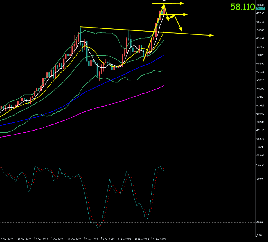白银周二(12.2)最高试探58.64美元/盎司,最低触及56.58元/盎司。收盘于58.45美元/盎司。周三(12.3)开于58.43美元/盎司,截至目前最高上探至58.96元/盎司,最低试探至57.51,现报58.12元/盎司附近.