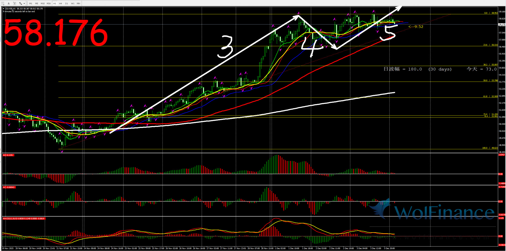 2、白银回调关注57.70附近做多,止损:57.20;目标:58.20;58.70;59.20;