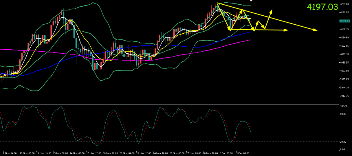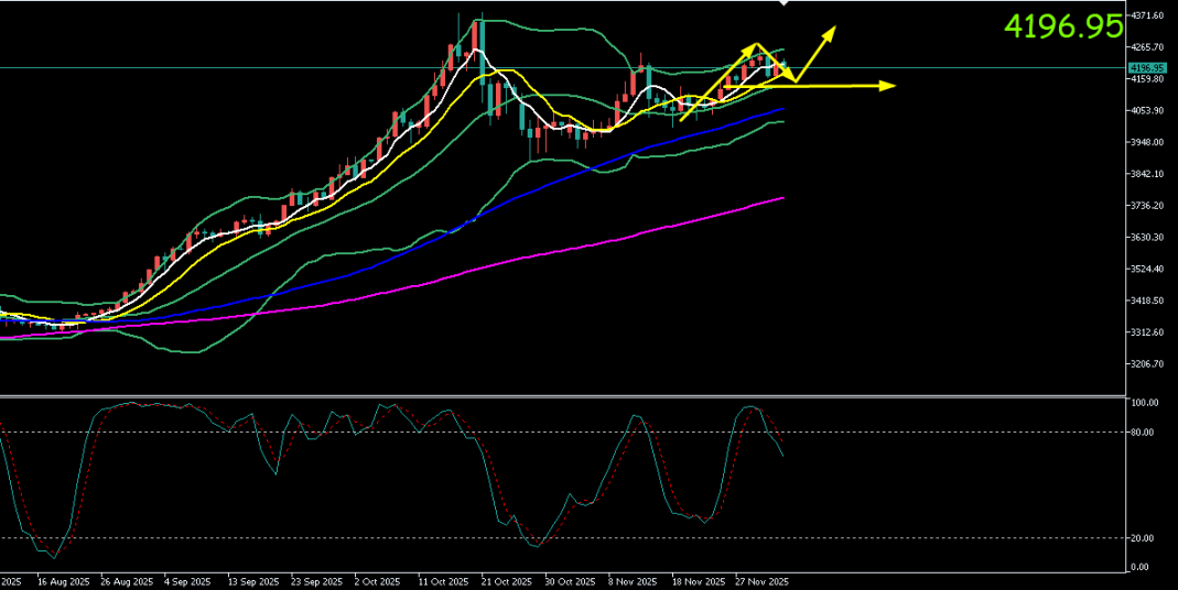 黄金周三(12.4)最高上探至4241.46美元/盎司,最低触及4194.62美元/盎司。收盘于4201.94美元/盎司,周四(12.5)开于4202.53元/盎司,截至目前最高上探至4216.87美元/盎司,最低触及4187.01美元/盎司,黄金早间冲高回落,现报价4197.32