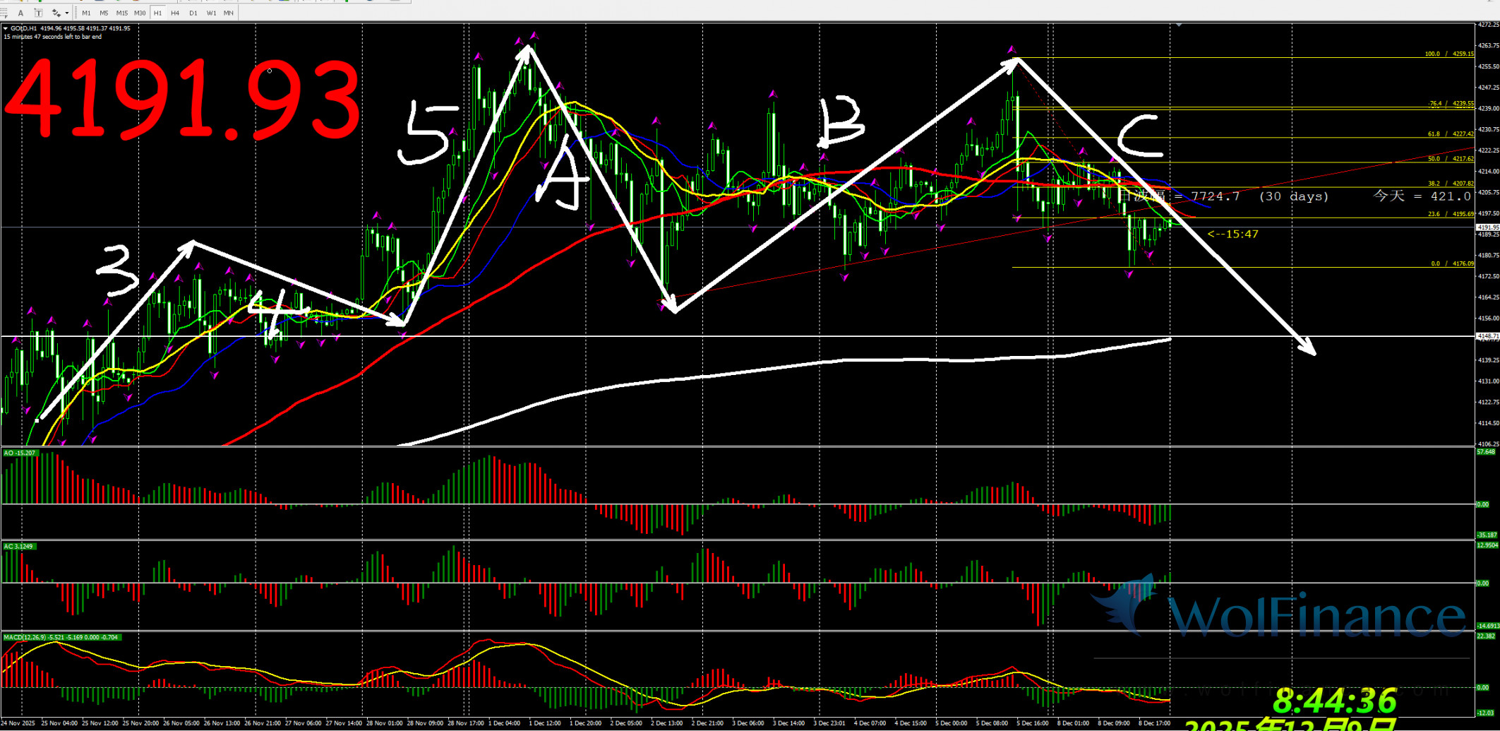 日线级别行情处于4浪行情,关注4浪行情走势,在日线图中关注压力倾向在日线图4285一线附近;支撑倾向在日线图50%(3845);61.8%(3719);四小时行情处于5浪状态,关注5浪的行情走势。支撑倾向在3930附近。1小时图AO零轴上红色,AC零轴下红色,代表在小时图中,行情倾向隔夜小时图处在4浪行情,目前在小时图中关注5浪的行情走势,下方支撑3930附近。在1小时图中,行情上涨压力关注4285附近。