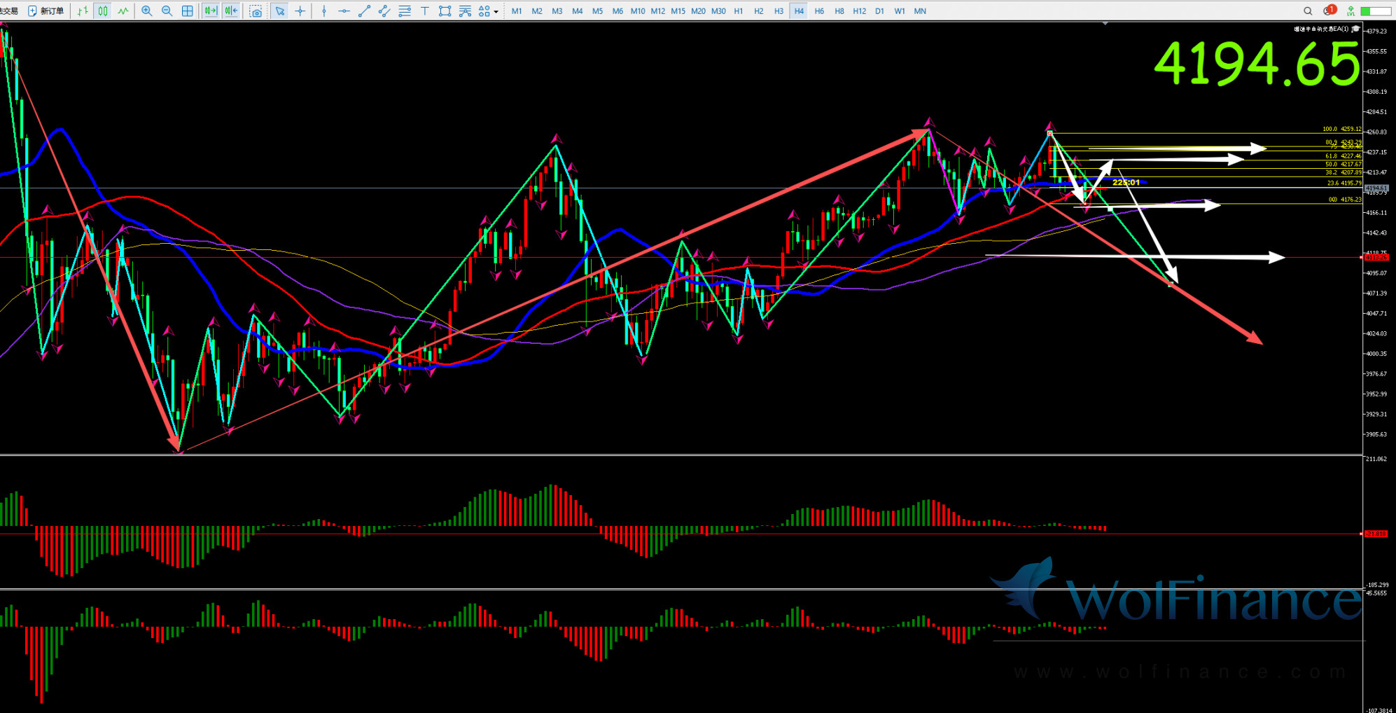 解析:日线AO红色 和AC红色,4小时AO红色和AC红色,日线自4381下跌至日线的蓝色线和60均线至3886后反弹至目前4267附近;12小时上自4381下跌至89均线判定为A浪,之后反弹4245后再次下跌至89均线后再次反弹至4267完成后B浪反弹,是故后市若后市金价不过4267则12小时有走下跌C预期下方关注金价跌至12小时的60均线预期;当下金价自3997涨至4267此段上涨2小时上判定为4-c浪中,上周五和昨日的下跌有效跌破2小时的89均线且昨日是30分钟的混沌点下破,跌至3小时的89均线后反弹至4197附近,目前金价自4267下跌至4176此段下跌1小时上处于下跌主浪中,30分钟上来看目前处于下跌主浪中要么就是下跌3浪或者下跌5浪中,日内关注4208-4219压力预期,若上不去则判定为下跌3浪中下方4148-4138-4120-4107一带目标预期;若反弹站上4219则为5浪预期上方关注4227-4238-4248压力预期后看1小时的下跌主3浪预期,是故日内关注4202-4219的多空争夺,若上不去则继续看跌预期,若站上去则判定为震荡偏空预期。