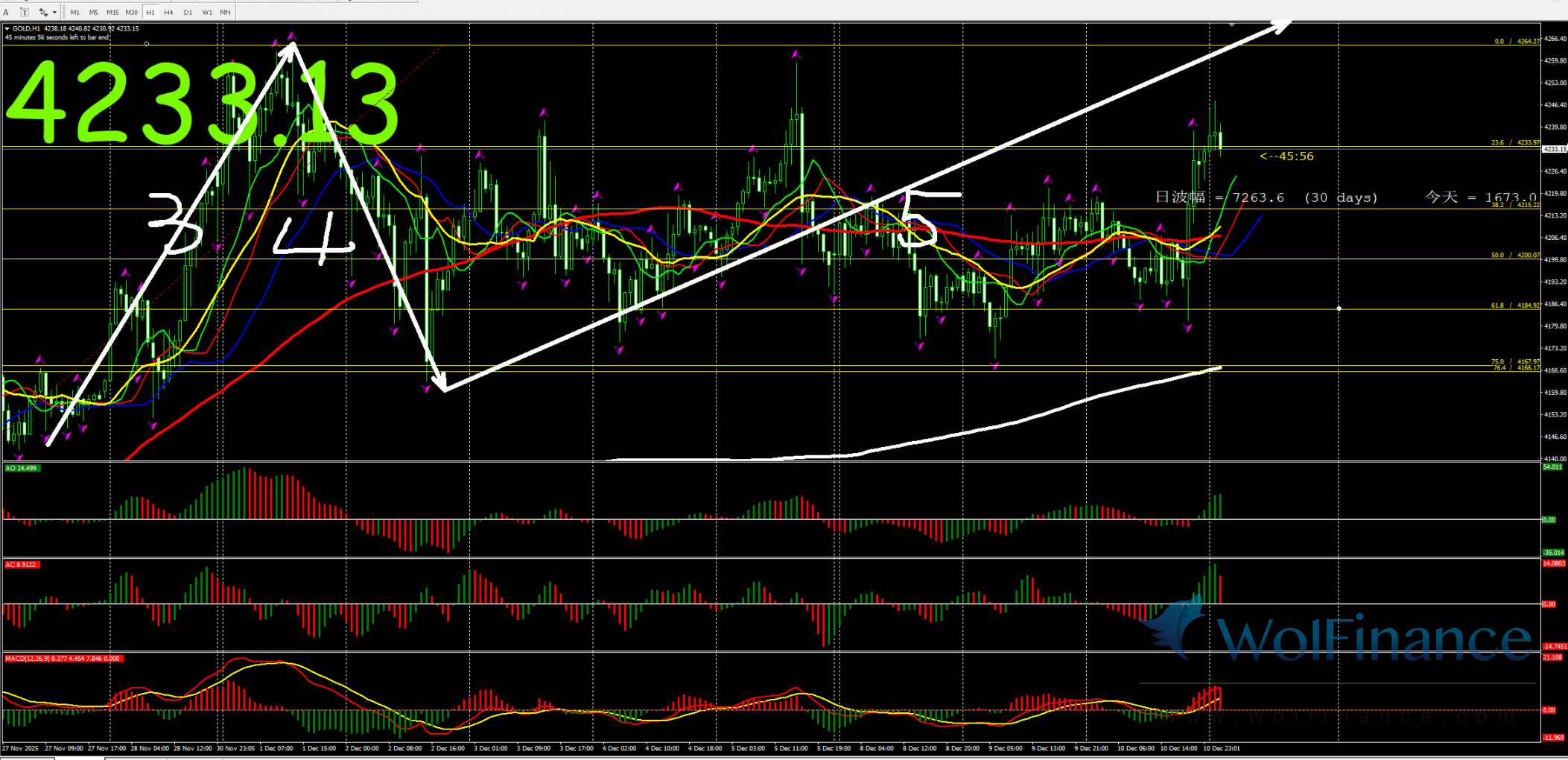 日线级别行情处于4浪行情,关注4浪行情走势,在日线图中关注压力倾向在日线图4285一线附近;支撑倾向在日线图50%(3845);61.8%(3719);四小时行情处于5浪状态,关注5浪的行情走势。支撑倾向在3930附近。1小时图AO零轴上绿色,AC零轴上红色,代表在小时图中,行情倾向隔夜小时图处在4浪行情,目前在小时图中关注5浪的行情走势,下方支撑3930附近。在1小时图中,行情上涨压力关注4285附近。