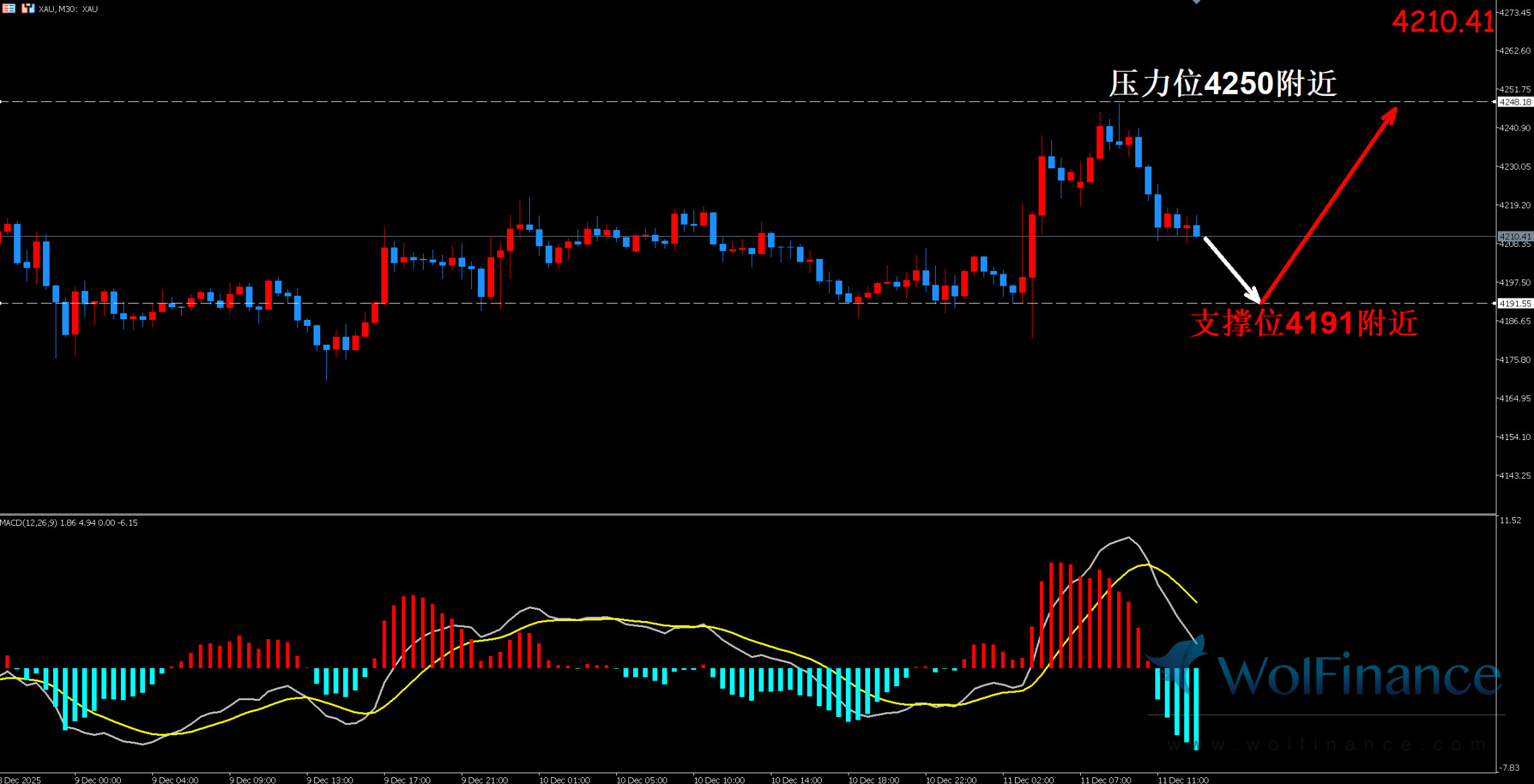 周四(12月11日)亚市午盘,现货黄金继续下跌,目前交投于4209美元/盎司附近,周四亚洲交易时段稳步走高至4240美元附近,市场继续对美联储最新政策决定作出反应。美联储再次降息25个基点,使政策利率下调至3.50%—3.75%,为过去三年最低水平。利率曲线的进一步下移,使无息资产的吸引力明显增强,为金价提供了持续支撑。 在政策发布会上,美联储主席鲍威尔强调决策层需要更多时间观察今年连续降息的传导效果。未来几周的经济数据将在很大程度上影响1月会议的判断。市场目前预计,美联储下月维持利率不变的概率升至78%,高于降息宣布前的70%。我们需要看到降息如何在未来几个月影响经济。”——鲍威尔, 从市场定价角度来看,利率未来进入持稳阶段,有望为黄金延续上行提供缓冲。美债收益率在政策公布后回落,使资金重新配置至对冲资产。 地缘政治因素则构成另一关键变量。据英媒报道,美国总统特朗普向乌克兰总统泽连斯基施压,要求其在圣诞节前接受和谈方案,而泽连斯基正在准备修订后的和平文件。