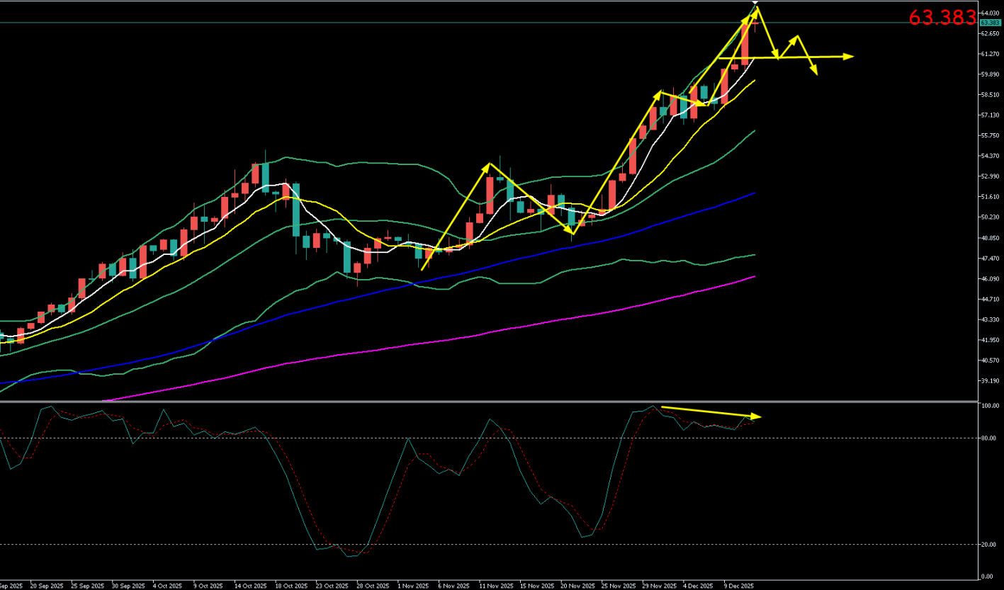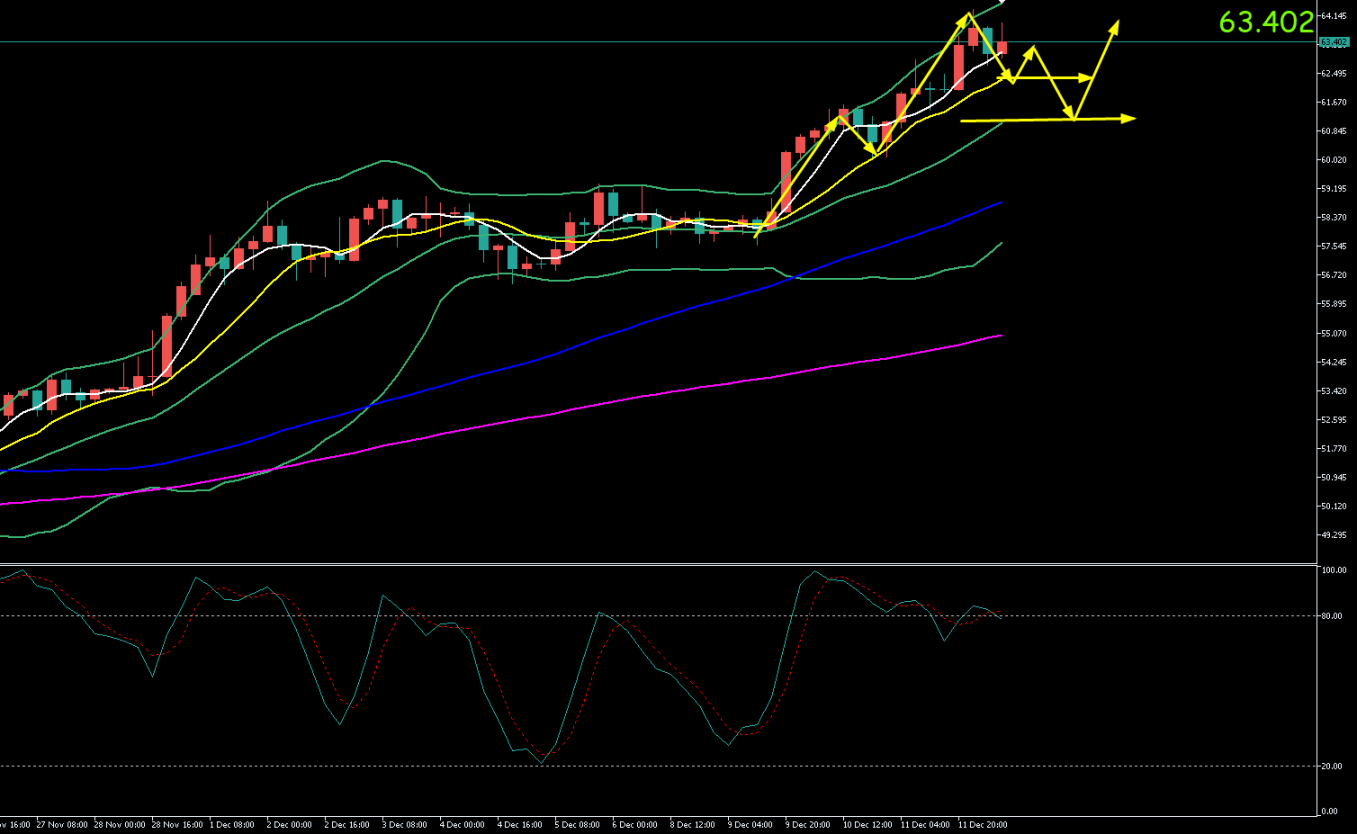 白银日线级别昨日收强阳,早间价格冲高回落遇阻64.3一线水平。日线级别随机震荡指标严重超买,K线远离5MA水平。白银中期看涨趋势不变,当需要当心短期回踩风险。4小时级别价格延5MA上行,下方支撑关注10MA以及4小时布林中轨附近支撑。62.34-61支撑的表现。短期在5MA一线存在支撑63附近。63不破银价亚欧盘则有概率进一步试探新高。反之价格有概率试探下方62.34-61水平。目前银价严重超买警惕短期回落风险。日内仍以低多思路操作为主。