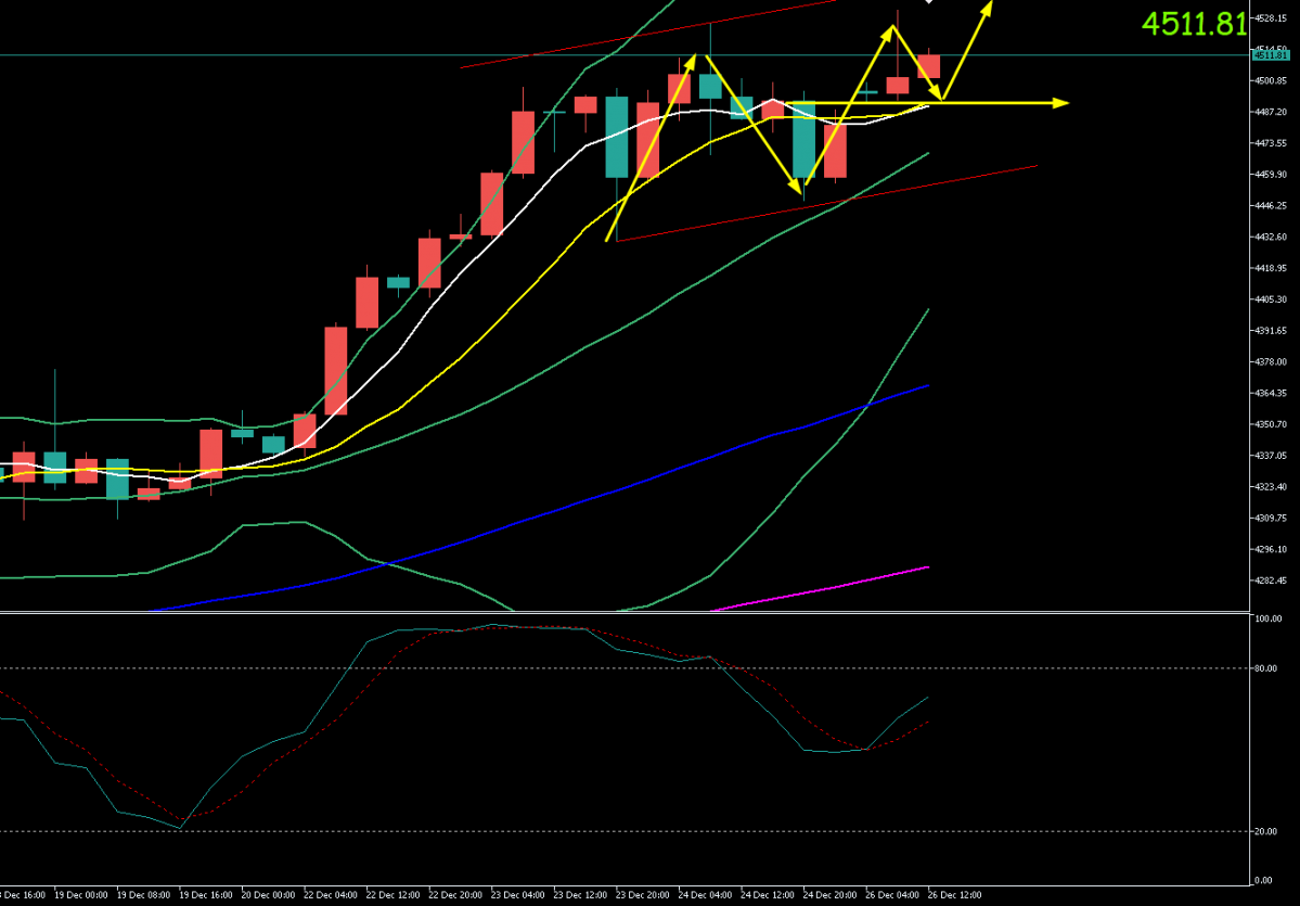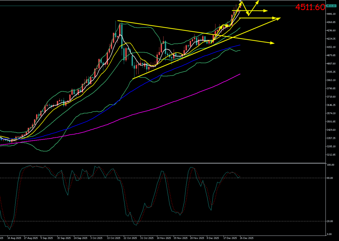 现货黄金周三(12月24日)圣诞前夜交易清淡,维持高位整固。盘中最高上探至4526.00美元/盎司,最低回踩至4468.00美元/盎司附近,最终收盘于4480.00美元/盎司附近,日线收出带上下影线的小阴线。周五(12月26日)亚市,随着全球市场从假期中归来,金价开盘于4485.00美元/盎司并重拾升势。买盘情绪依然高涨,盘中价格持续攀升,最高触及4530.60美元/盎司,再度刷新历史纪录。随后出现技术性回调,截至北京时间13:35,最低探至4492美元/盎司,现交投于4511美元/盎司附近。
