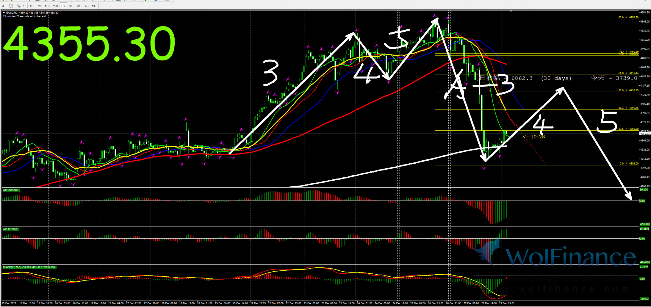 日线级别行情处于5浪行情,关注5浪行情走势,在日线图中关注压力倾向在日线图4551-53一线附近;支撑倾向在日线图50%(4210);61.8%(4133);四小时行情处于5浪状态,关注5浪的行情走势。支撑倾向在4290附近。1小时图AO零轴下绿色,AC零轴上绿色,代表在小时图中,行情倾向隔夜小时图处在5浪行情,目前在小时图中关注5浪的行情走势,下方支撑4400附近。在1小时图中,行情上涨压力关注4551-53附近。