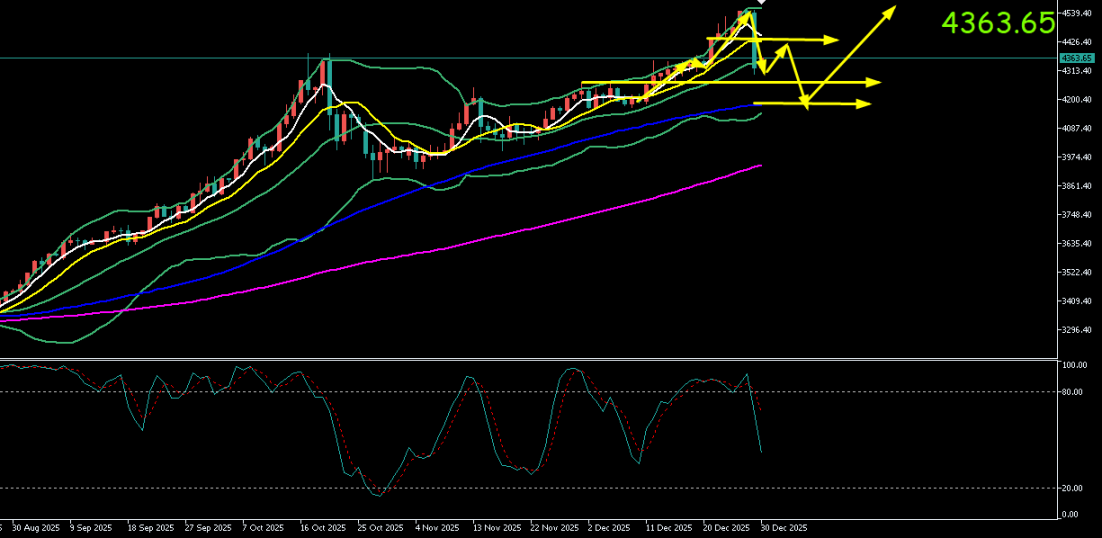 金价以大阴线接连跌破5日、10日短期均线,并威胁20日均线支撑,这是自11月上涨以来首次出现的强势转弱信号。日线级别的上涨形态已被破坏,市场进入深度调整阶段。下方需要关注4310-25区域能否提供支撑,若失守则可能进一步下探4300整数关口。