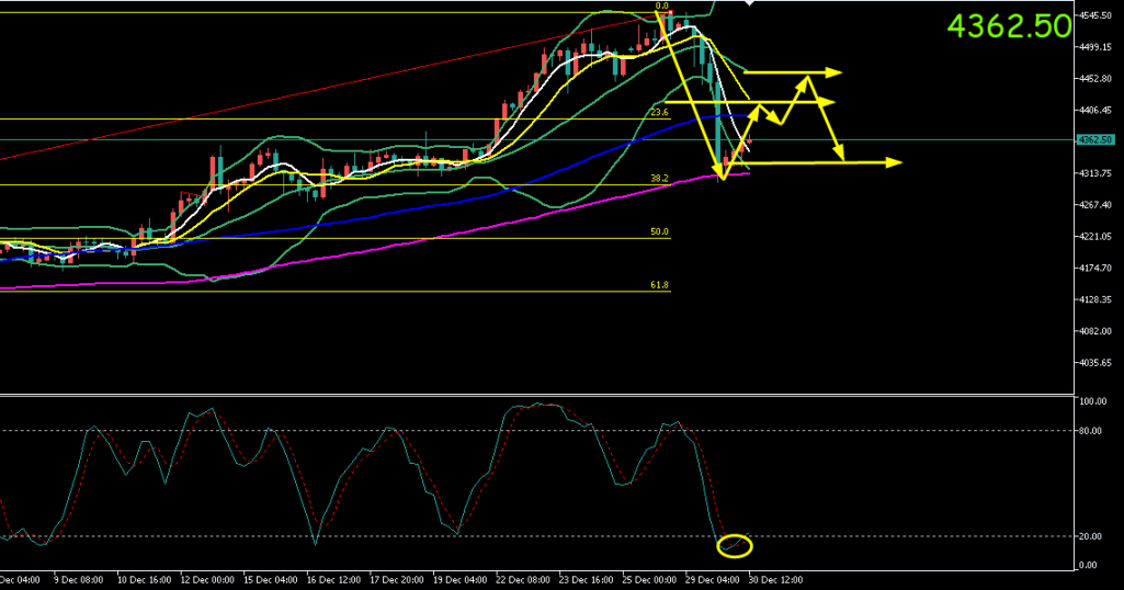 现货黄金周一(12月29日)延续高位震荡。盘中多空博弈激烈,最高上探至4540.25美元/盎司,最低回踩至4300美元/盎司,最终收盘于4330美元/盎司。周二(12月30日)亚市,金价开盘于4334.55美元/盎司,开盘后因美联储会议纪要内容平淡无“鸽”,市场失望情绪引发抛售。价格持续震荡下行,日内最低已触及4324.08美元/盎司,大幅跌破多个关键支撑。金价在低位短暂企稳,现交投于4368美元/盎司附近,创下两个月来最大单日跌幅。