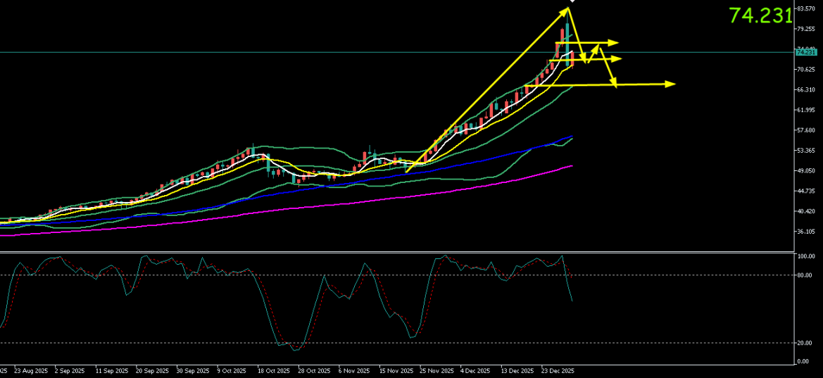 现货白银周一(12月29日)上演史诗级过山车行情。在亚市早盘最高上探至83.62美元/盎司的历史峰值后,遭遇全线抛售,价格直线坠落,最低暴跌至70.47美元/盎司,日内震幅超过10%。日线最终收盘于72.美元/盎司附近,留下一根破坏性极强的巨型阴线。周二(12月30日)亚市,银价开盘于72.22美元/盎司附近,开盘后试图反弹,但力度疲弱,盘中最高仅触及74.57美元/盎司便再次承压。价格最低下探至71.18美元/盎司,现交投于74美元/盎司附近,目前银价暴跌后的弱势修复。