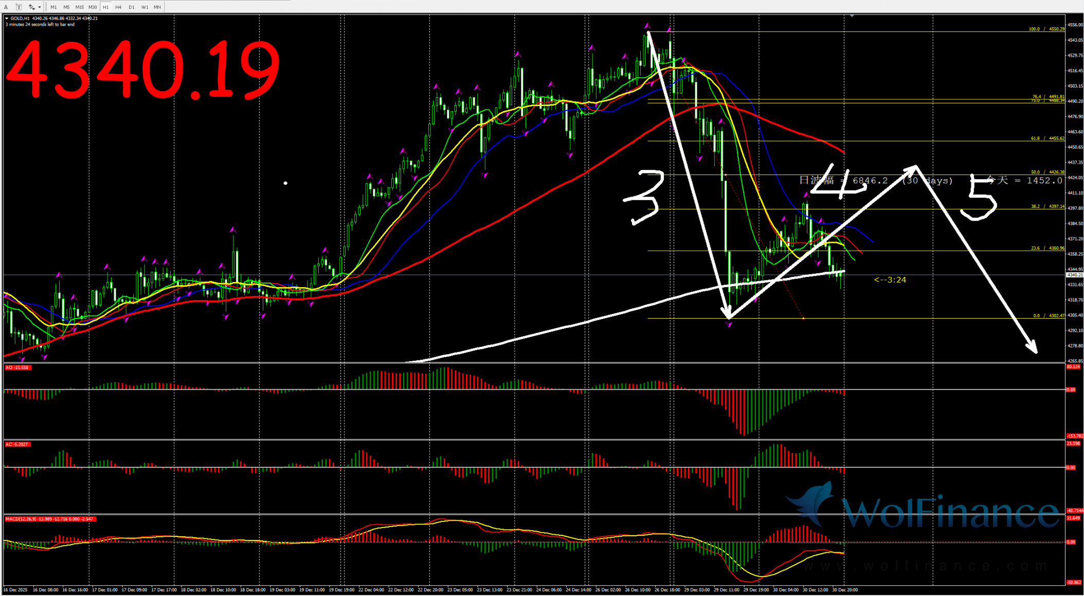 日线级别行情处于5浪行情,关注5浪行情走势,在日线图中关注压力倾向在日线图4551-53一线附近;支撑倾向在日线图50%(4210);61.8%(4133);四小时行情处于5浪状态,关注5浪的行情走势。支撑倾向在4290附近。1小时图AO零轴下红色,AC零轴下红色,代表在小时图中,行情倾向隔夜小时图处在3浪行情,目前在小时图中关注4浪的行情走势,下方支撑4300附近。在1小时图中,行情上涨压力关注4451-53附近。