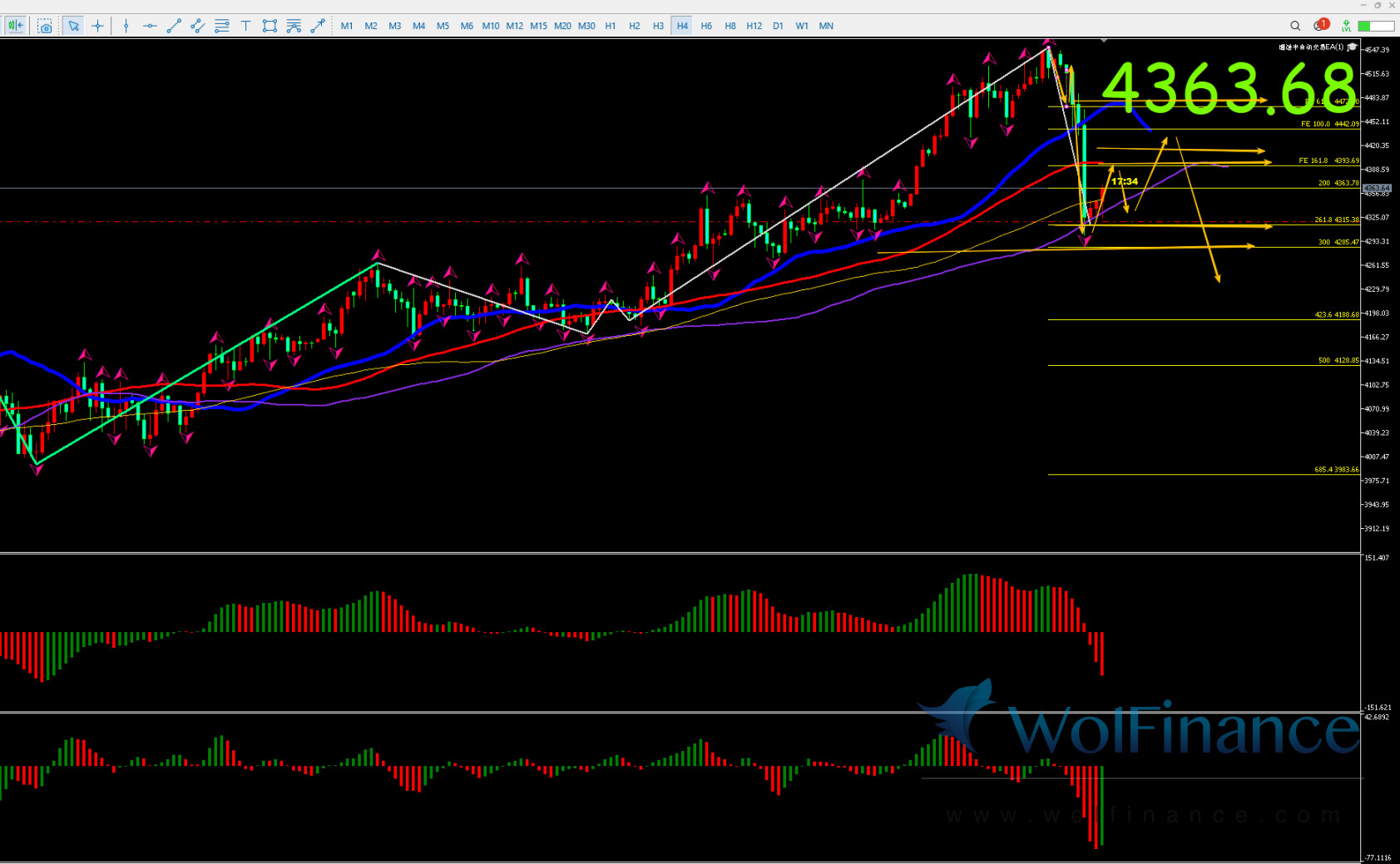 解析:日线AO红色 和AC红色,4小时AO红色和AC绿色,日线自4381下跌至日线的蓝色线和60均线至3886下跌段判定为12小时的回调A浪,3886-4245上涨段为B浪,4245-3999这段判定为衰竭C浪;目前金价自3999创了4284的开启了12小时的5浪上涨走势中,且以3小时的上涨来完成是故后市关注3小时的89-120均线作为12小时完成5浪完成的标志线;目前3小时处于5-3上涨中,金价自4163涨至当下处于自1小时处于5-3-3上涨中,金价涨至4497后跌至30分钟的60-89均线支撑后再次创了高点至4525附近,30分钟完成了4浪调整后在创新高是故当下判定为1小时处于上涨,金价涨至4549附近后下跌至30分钟的120均线下方4472后反弹至4520附近后再次下跌且连续下跌至4小时的120均线4301附近后开始反弹,昨日金价反弹至30分钟的60均线和89均线和1小时的蓝色线附近压力区4395-4405后再次下跌,目前30分钟开启了反弹4浪,昨日的上涨判定为30分钟的反弹4-A浪,目前金价回调判定为30分钟的的b浪回调或5浪下跌预期,日内关注下方关注4340-4325一带支撑预期,若下不去则看30分钟的反弹C预期上方看向4450-4466-4485压力预期;若被跌破则下看-4285-4276-4265支撑预期。