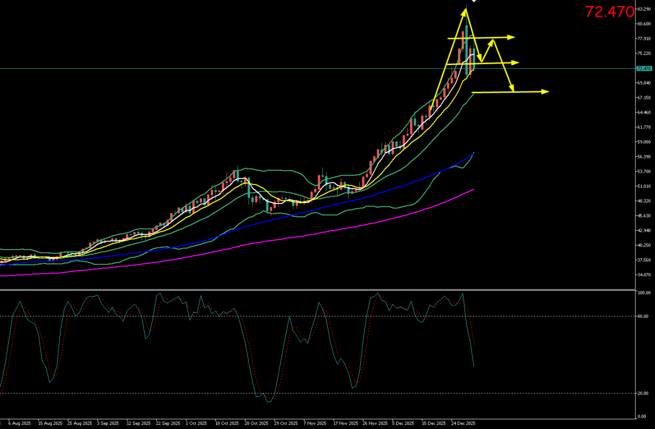 银价在经历了周一的史诗级暴跌和周二的回调性反弹后,今日再次形成收阴,一个典型的“下跌抽穗”形态。这表明周二的暴跌后的技术性反扑,市场空头力量依然信号主导。价格已有效跌破5日、10日短期均线,日线水平的上涨趋势明显破坏,市场正式进入调整阶段。下方需密切关注70.00-72.00美元区域的前期平台支撑。