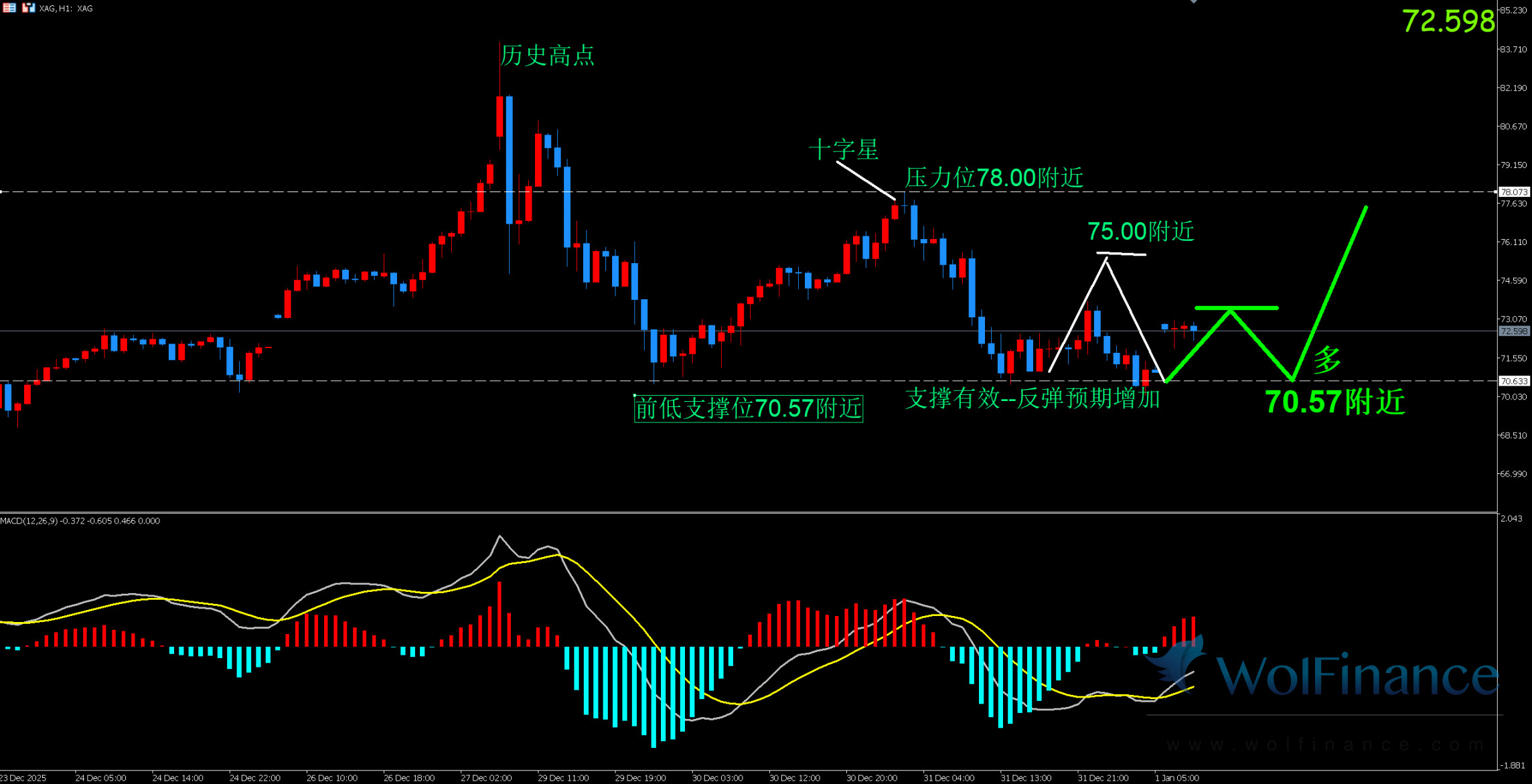 1. 白银技术图表显示目前K线支撑位70.57附近