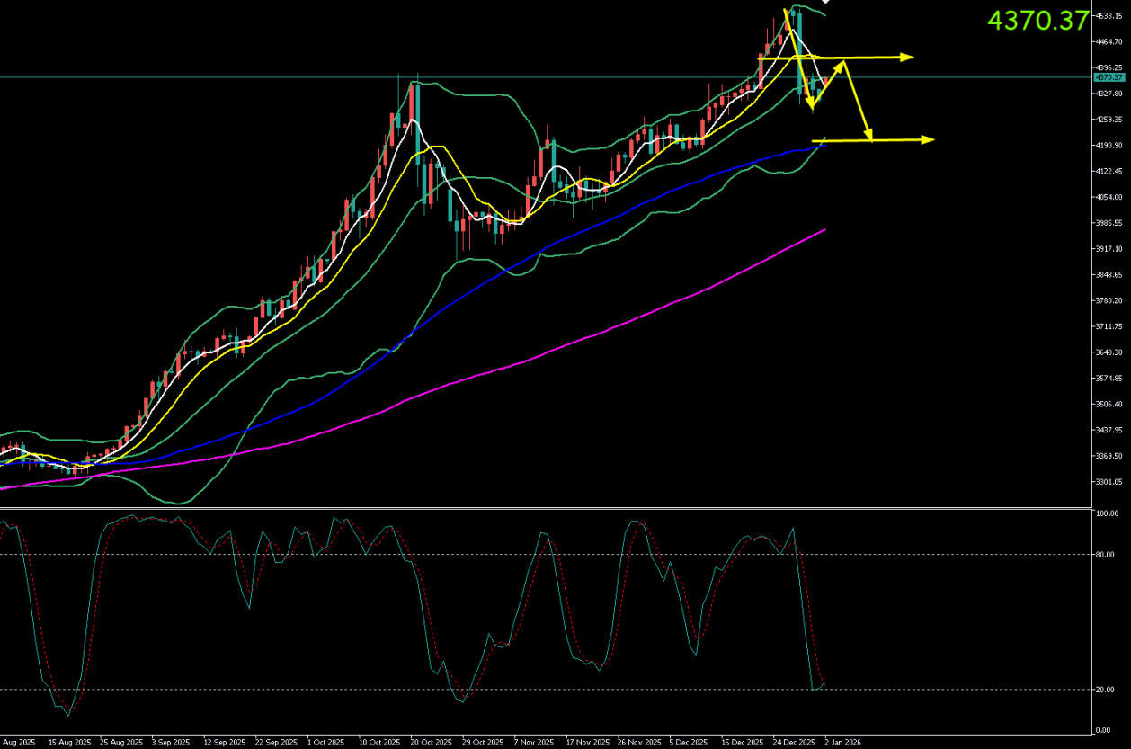 金价新年跳空高开,显示多头情绪积极。日线级别在前期回调后,于4300美元关口上方获得支撑,目前正尝试修复短期均线系统。若今日能收于开盘价上方,将形成积极的“启明星”雏形,为后续反弹积蓄动能。当前关键任务在于有效站稳4350-4360美元区域,以确认调整结束并重启升势。