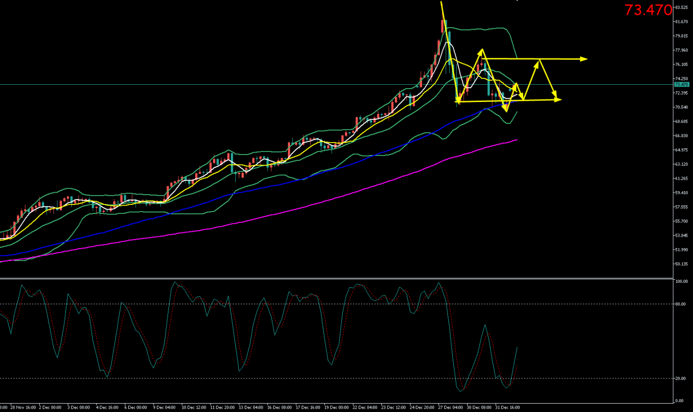 银价新年高开低走,日线录得阴线,确认了75美元关口已成为强阻力区。价格持续运行于所有短期均线下方,均线系统呈空头排列,日线级别的调整趋势明确。目前正在测试72.00-73.00美元区域的关键支撑,该区域是前期多次验证的平台。若有效跌破,下跌空间恐将进一步打开。