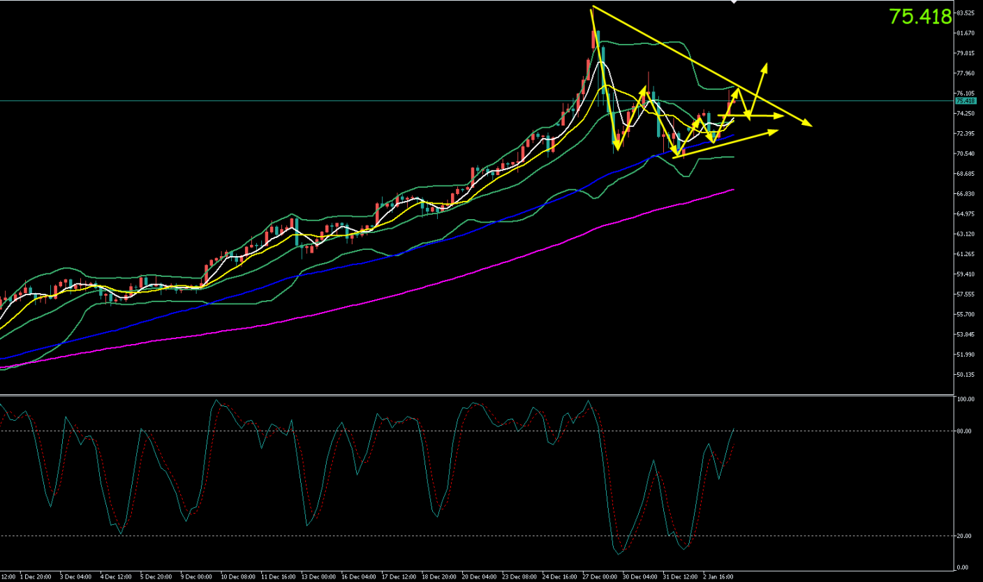 价格触及77.8美元上方轻仓短空,并必须将止损设置在78.00美元上方。目标77.2 76.5.