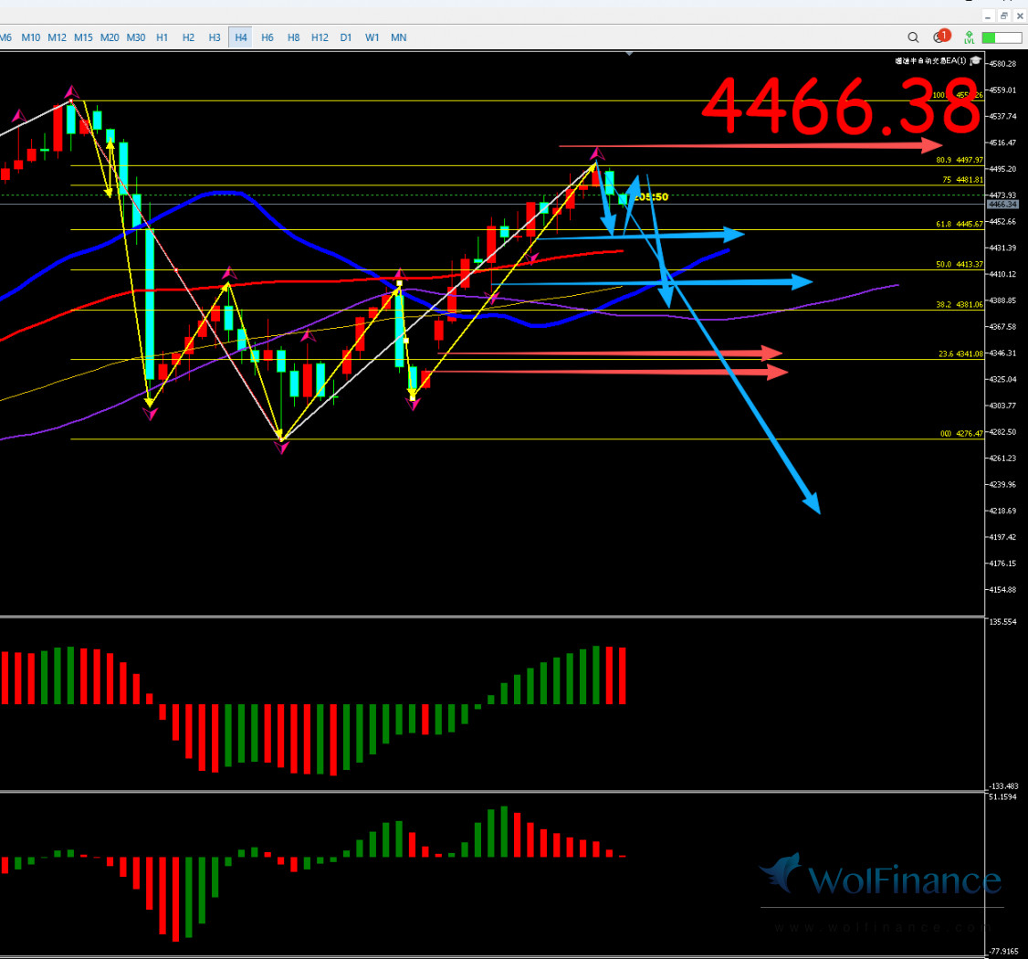 解析:日线AO绿色 和AC绿色,4小时AO红色和AC绿色,日线自4381下跌至日线的蓝色线和60均线至3886下跌段判定为12小时的回调A浪,3886-4245上涨段为B浪,4245-3999这段判定为衰竭C浪;目前金价自3999创了4284的开启了12小时的5浪上涨走势中,且以3小时的上涨来完成是故后市关注3小时的89-120均线作为12小时完成5浪完成的标志线;目前3小时处于5-3上涨中,金价自4163涨至当下处于自1小时处于5-3-3上涨中,金价涨至4497后跌至30分钟的60-89均线支撑后再次创了高点至4525附近,30分钟完成了4浪调整后在创新高是故当下判定为1小时处于上涨,金价涨至4549附近后下跌至30分钟的120均线下方4472后反弹至4520附近后再次下跌且连续下跌至4小时的120均线4301附近后开始反弹,昨日金价反弹至30分钟的60均线和89均线和1小时的蓝色线附近压力区4395-4405后再次下跌,金价跌至12小时的60均线4274后反弹,目前反弹至4550-4274下跌段的38.2%4379附近,上周五金价最终反弹至4401附近后快速回调回补缺口4319后最低至4309附近,30分钟上走出完整的ABC浪,30分钟的目前走着反弹C浪预期,由30分钟的反弹ABC看为是2小时的反弹B浪,昨日金价反弹至4481-4516-4532区间4500后跌至1小时的120均线附近,目前金价30跌破120均线下方目前金价维持在4500-4423之间震荡,金价连续从4423反弹均未站上30分钟的60均线和1小时的蓝色线走势下方,昨日的下跌判定为30分钟的A浪,自4423反弹至4468判定为反弹B浪,当下结合走势金价有走30分钟的下跌C浪预期,日内关注1小时的89均线及4423的多空争夺,若下不去则看1小时的反弹B浪及5浪预期即4481-4405-4516-4522压力预期;若跌破1小时的89均线则直接看30分钟的下跌C浪的预期下方关注4407-4391-4344-4314。