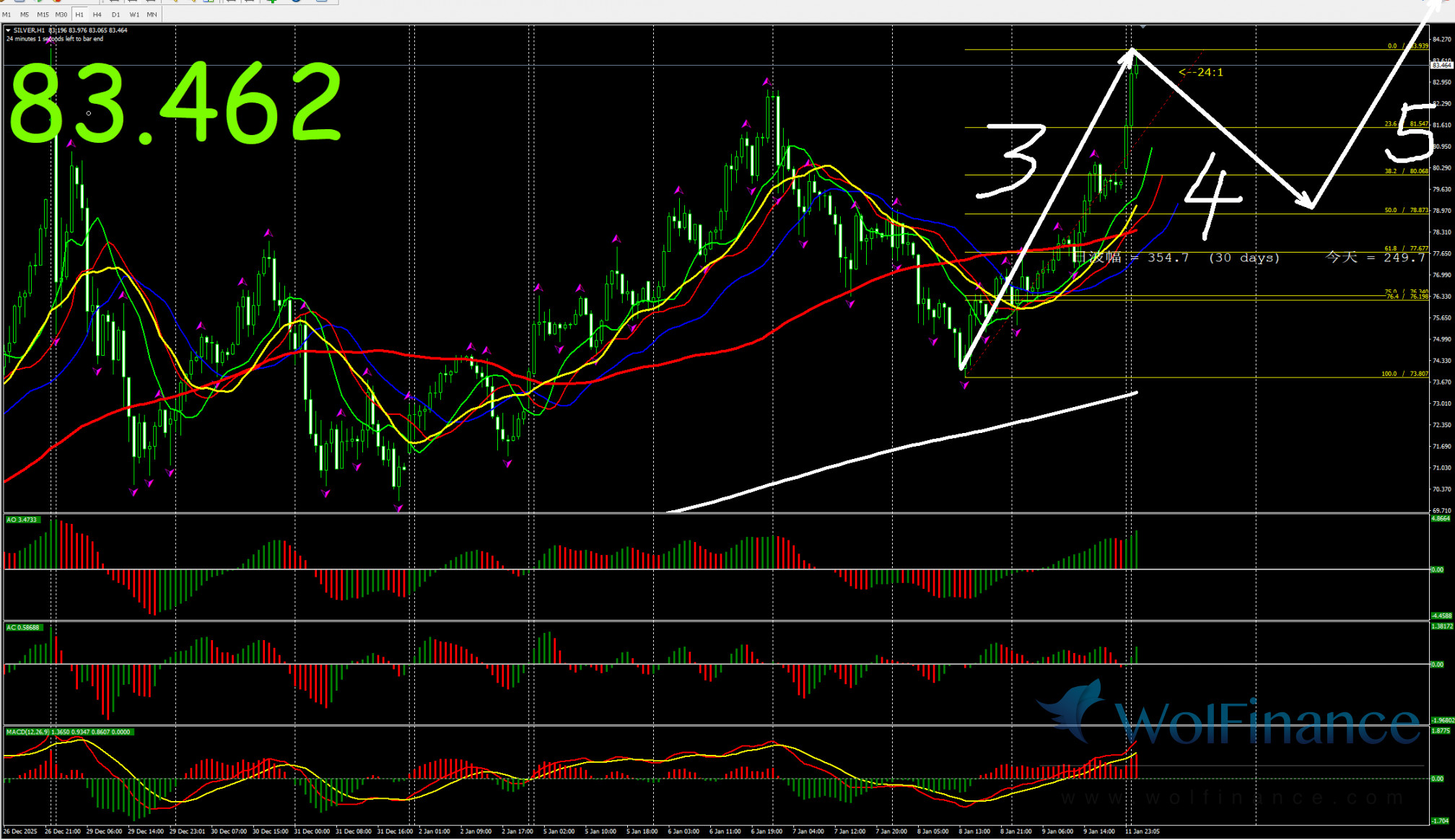日线图目前处在3浪之中,关注3浪的行情走势。压力倾向在日线图84.30一线附近;支撑倾向在日线图50%(64.80)和61.8%(60.30)一线附近;四小时行情处在5浪走势;1小时图AO零轴下绿色;AC零轴上红色,行情在小时图356日线之上运行;小时图关注84.30附近的压力;所以今日关注1小时图震荡行情。