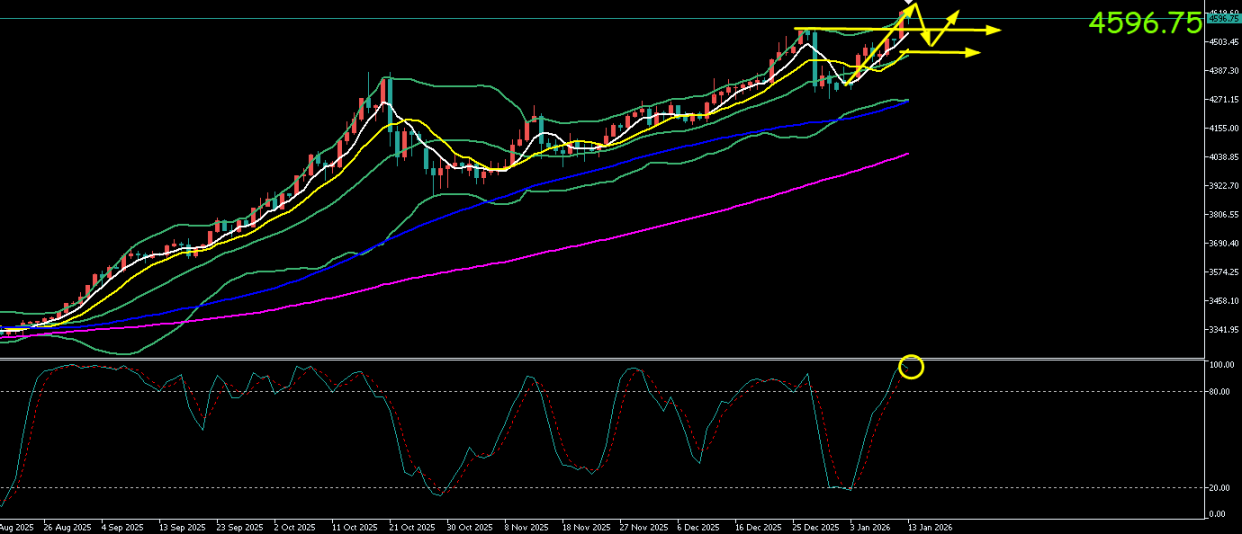 现货黄金周一(1月12日)在风险事件驱动下剧烈波动。受周末突发地缘政治与美联储相关消息刺激,金价大幅高开于4518美元/盎司,开盘后急速拉升,最高触及4630美元/盎司的历史新高。随后巨额获利盘涌出,价格大幅回撤,最低下探至4512美元/盎司以测试缺口支撑,最终收盘于4575美元/盎司附近。周二(1月13日)亚市,市场进入对昨日极端行情的消化阶段。金价开盘于4602.89美元/盎司,价格并未延续隔夜尾盘的跌势,而是在昨日震荡区间下沿获得买盘支撑。盘中温和反弹,最高触及4607.82美元/盎司,最低回踩4575.55美元/盎司。现货黄金交投于4596美元/盎司附近,日内小幅上涨,呈现高位震荡整理态势.
