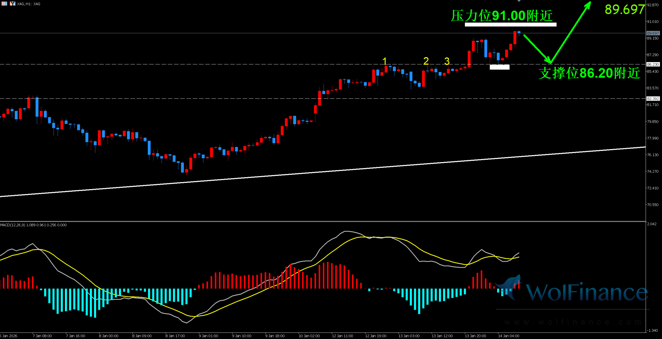 周三(01月14日)白银早盘继续上涨,谨慎可回落后多单布局。白现货白银刚刚突破89.80美元/盎司关口,通胀数据温和释放,降息预期虽稳但黄金承压初现美国12月消费者物价指数(CPI)的公布,本应是黄金多头的福音,却在实际走势中引发了市场的复杂反应。数据显示,CPI环比上涨0.3%,同比2.7%,核心CPI环比0.2%、同比2.6%,均低于分析师预期的0.3%和2.7%。这种温和通胀环境,确实强化了美联储今年降息的押注,市场预计全年将有两次降息,3月份降息至少25个基点的概率虽略降至27.4%,但整体消化了约50个基点的降息幅度。 低利率环境本该利好非孳息资产黄金,因为它降低了持有成本,并吸引避险资金流入。