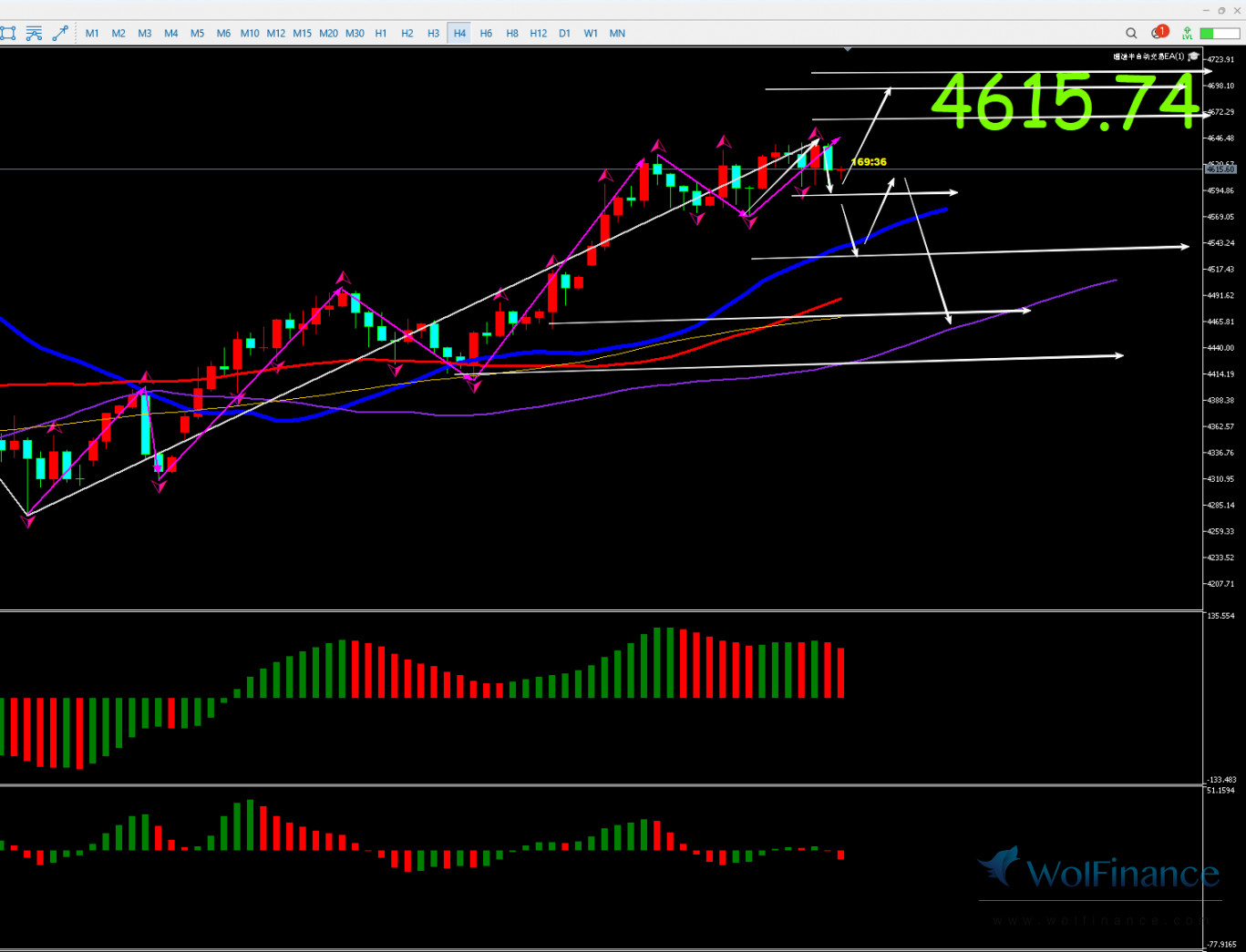 解析:日线AO绿色 和AC红色,4小时AO红色和AC红色,日线自4381下跌至日线的蓝色线和60均线至3886下跌段判定为12小时的回调A浪,3886-4245上涨段为B浪,4245-3999这段判定为衰竭C浪;目前金价自3999创了4284的开启了12小时的5浪上涨走势中,且以3小时的上涨来完成是故后市关注3小时的89-120均线作为12小时完成5浪完成的标志线;目前3小时处于5-3上涨中,金价自4163涨至当下处于自1小时处于5-3-3上涨中,金价涨至4497后跌至30分钟的60-89均线支撑后再次创了高点至4525附近,30分钟完成了4浪调整后在创新高是故当下判定为1小时处于上涨,金价涨至4549附近后下跌至30分钟的120均线下方4472后反弹,金价自4274反弹至4500后回调至2小时的60均线附近后至4407再次起涨,金价再次创新高至4635附近回落至30分钟的89和120均之间4570后再次再次起涨至4642附近此段上涨30分钟目前判定为5-1浪之后金价自4642跌至1小时的蓝色线和60均线4598附近未有效下破此段下跌判定为5-2浪,当下30分钟连续背离导致金价下跌,日内下方关注1小时的60均线和89的多空争夺,若不能有效下破4609-4581则继续关注30分钟的5-3浪预期上方关注创新高后奔向4660-4683-4693-4716-4734目标预期,若有效跌破则关注大周期背离预期引发金价完成30分钟的5浪结构完成走30分钟的调整预期下方关注2小时的89和120均线支撑预期及金价回调4451-4407调整预期。