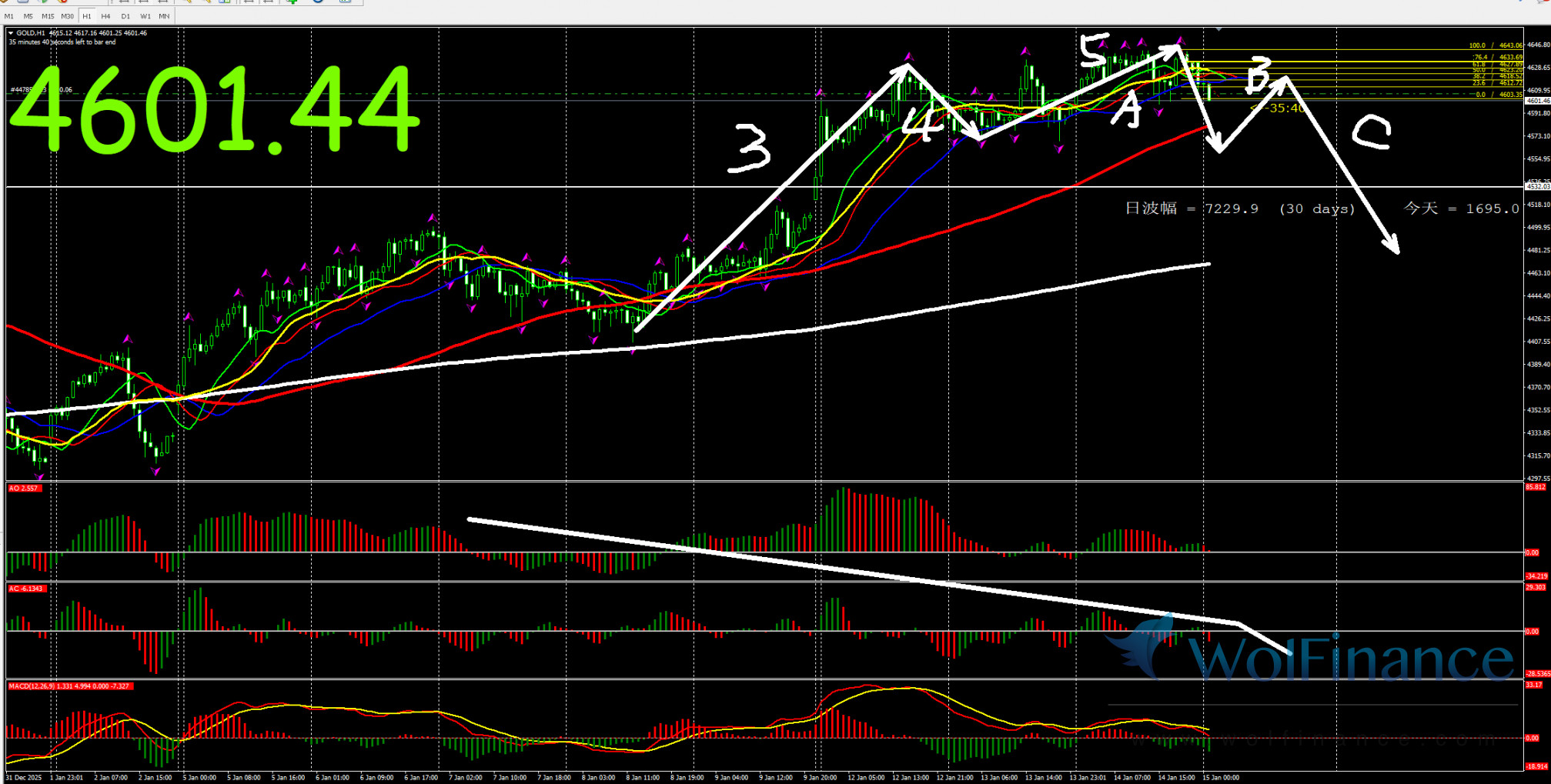 日线级别行情处于5浪行情,关注5浪行情走势,在日线图中关注压力倾向在日线图4613-15一线附近;支撑倾向在日线图50%(4243);61.8%(4160);四小时行情处于5浪状态,关注5浪的行情走势。支撑倾向在4430附近。1小时图AO零轴上红色,AC零轴下红色,代表在小时图中,行情倾向隔夜小时图处在2浪行情,目前在小时图中关注3浪的行情走势,下方支撑4430附近。在1小时图中,行情上涨压力关注4651-53附近。