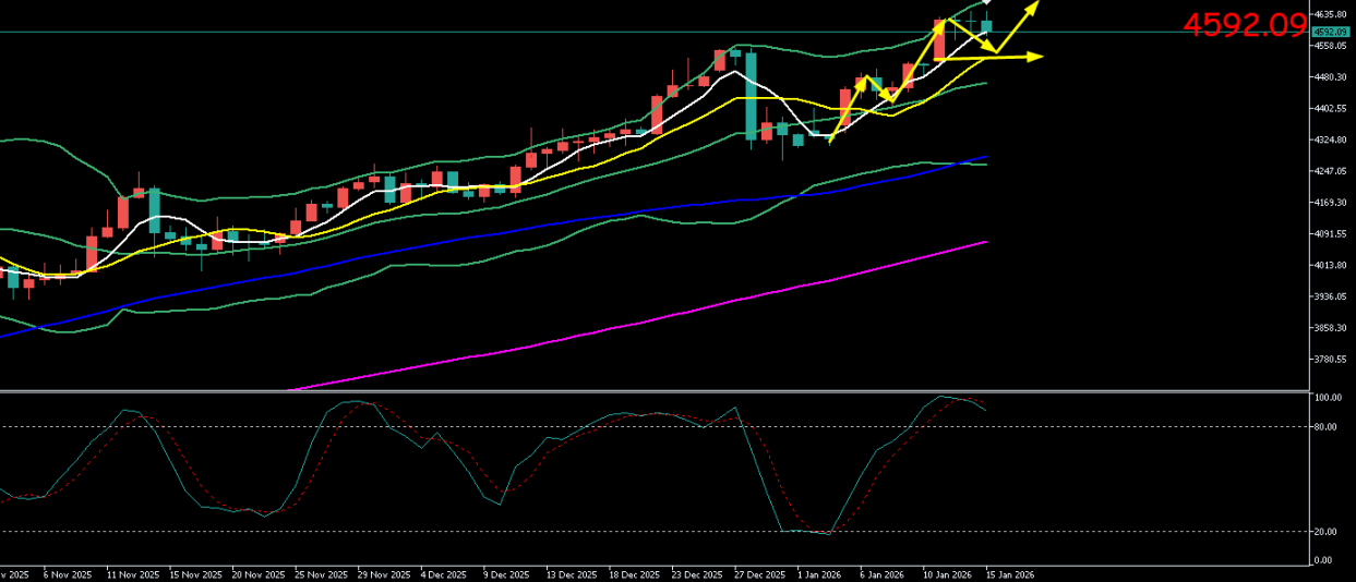 现货黄金周三(1月14日)从隔夜暴跌中强势反弹,收复大部分失地。价格开盘于4588.73美元/盎司后,在逢低买盘支撑下稳步走高,盘中最高触及4639.40美元/盎司,几乎完全收复前一交易日长上影线。最终收盘于4632.50美元/盎司附近。周四(1月15日)亚市,金价在连续两日剧烈波动后进入高位盘整阶段。金价开盘于4630美元/盎司,开盘后未能延续隔夜强势,因部分投资者在近期高点附近选择获利了结,价格震荡回落。盘中最高反弹至4635美元/盎司,最低下探至4581美元/盎司。现货黄金交投于4590美元/盎司附近。