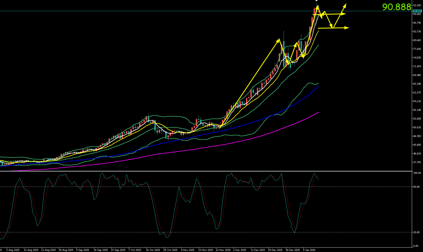 日线图显示,银价在创下历史新高后收出看跌的“吊首线”(又称上吊线)形态,这是一个强烈的短期顶部反转信号。这表明93-94美元区域存在巨大抛压,若短期内无法有效突破,则存在深度回调的风险。当前价格正在测试90美元整数关口,若失守,下一关键支撑区域在86-87美元。若该区域再被跌破,则调整可能进一步延伸至84-83.5美元,甚至80美元下方。