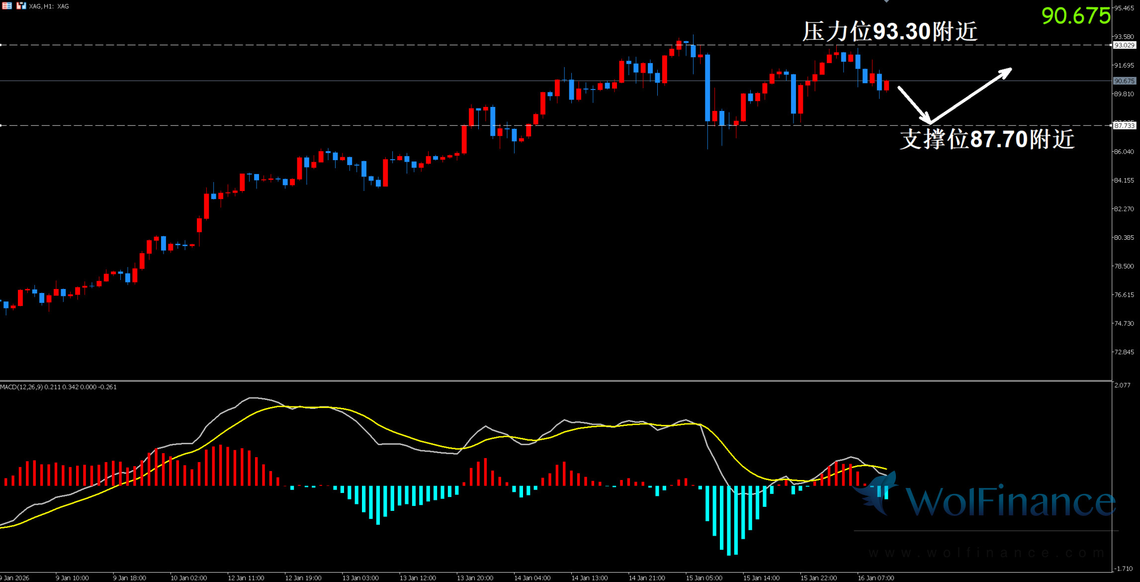 1. 白银技术图表显示目前K线支撑位87.70附近