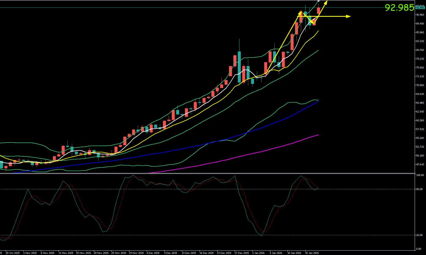 现货白银周五(1月16日)延续技术性回调。价格开盘于92.37美元/盎司后持续承压,盘中反弹乏力,最高仅触及92.80美元/盎司。空头氛围占据主导,价格震荡下行,最低下探至89.45美元/盎司,最终收盘于90.72美元/盎司附近,日线连续收阴。
