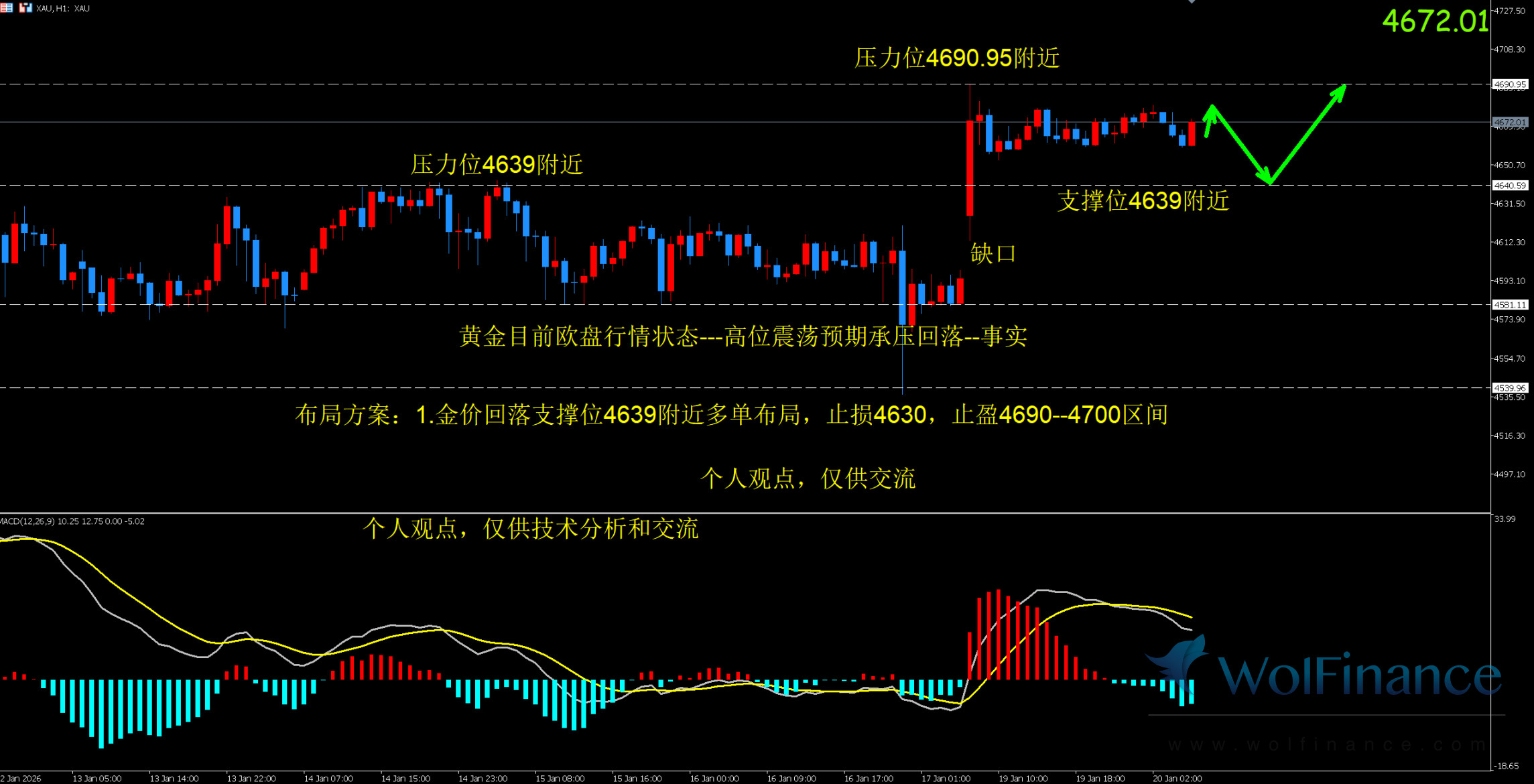 1.布局方案1:4639附近多单布局,止损4630, 止盈4679-----4699区间,