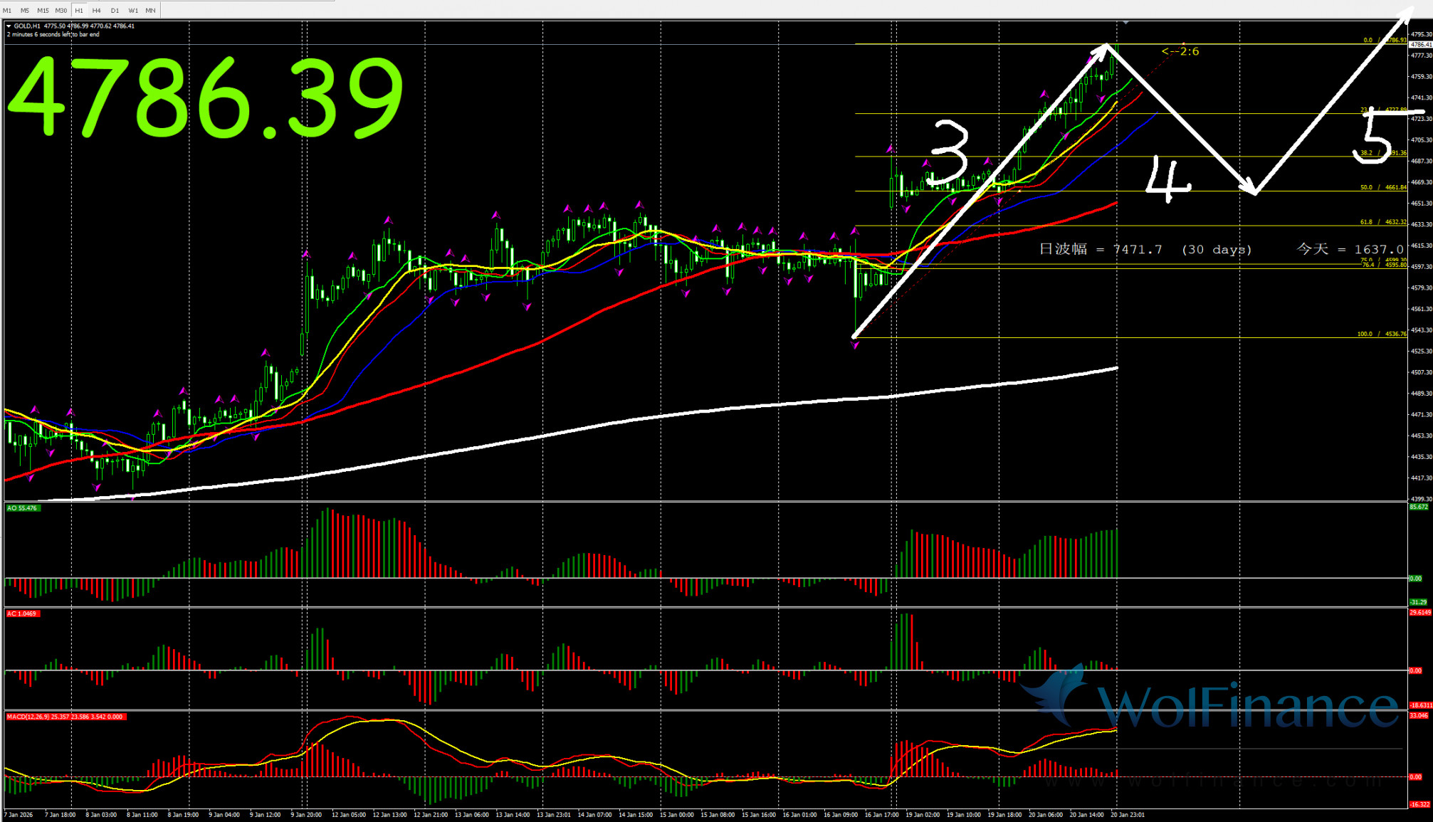 日线级别行情处于5浪行情,关注5浪行情走势,在日线图中关注压力倾向在日线图4831-33一线附近;支撑倾向在日线图50%(4335);61.8%(4230);四小时行情处于5浪状态,关注5浪的行情走势。支撑倾向在4430附近。1小时图AO零轴上绿色,AC零轴上红色,代表在小时图中,行情倾向隔夜小时图处在5浪行情,目前在小时图中关注5浪的行情走势,下方支撑4430附近。在1小时图中,行情上涨压力关注4760附近。