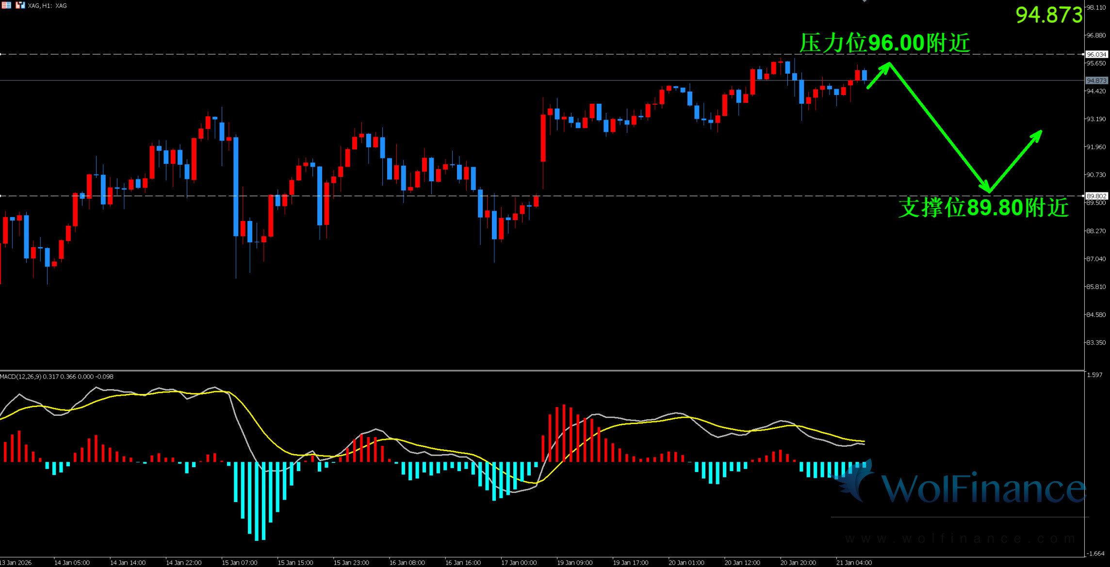 周三(01月21日)白银早盘高开大涨走高,高位承压后多单布局方案,最新报90.94美元/盎司,避险情绪高涨:黄金白银双双创纪录新高面对这一地缘政治不确定性,现货白银价格在触及每盎司95.87美元的历史高位后,小幅回落0.3%,收于94.38美元。白银在2025年录得约147%的惊人涨幅,今年内又上涨了超过32%。铂金和钯金价格也分别上涨2.3%和1.1%。在2026年开年之际,一场由美国总统特朗普引发的格陵兰岛主权风暴席卷全球,彻底点燃了地缘政治火药桶。特朗普公开宣称“没有回头路”,甚至不排除武力选项,并通过AI图像强势展示“美国版图”野心,这不仅让北约盟友丹麦强硬回击,也引发欧洲多国集体愤怒与贸易战恐慌。全球安全格局摇摇欲坠。地缘政治紧张局势继续推升黄金的避险需求,现货黄金价格一举突破每盎司4700美元创历史新高,白银冲破95美元,美元、美股与美债双双承压。这场危机正将避险情绪推向极致,黄金再度成为乱世中的“硬通货”。现货黄金延续涨势,再度刷新历史记录高点,最高触及4780.98美元/盎司。