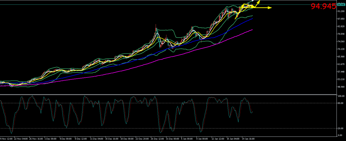 4小时图呈现清晰的箱体震荡形态。价格在创出新高后,上行力度减弱,MACD指标于高位有形成死叉或持续钝化的迹象,显示短期上涨动能有所衰减。目前价格正在测试布林带中轨的支撑力度。亚欧盘需关注价格能否在94.50美元附近获得有效支撑并再度向上发起冲击。若震荡后能有效站稳95.50美元上方,则可能开启新一轮升势;反之,若失守93.50美元,则调整可能加深。