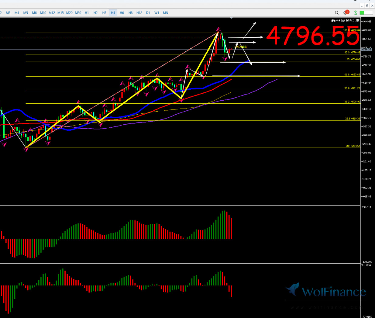 解析:日线AO绿色 和AC绿色,4小时AO绿色和AC绿色,日线自4381下跌至日线的蓝色线和60均线至3886下跌段判定为12小时的回调A浪,3886-4245上涨段为B浪,4245-3999这段判定为衰竭C浪;目前金价自3999创了4284的开启了12小时的5浪上涨走势中,且以3小时的上涨来完成是故后市关注3小时的89-120均线作为12小时完成5浪完成的标志线;目前3小时处于5-3上涨中,金价自4163涨至当下处于自1小时处于5-3-3上涨中,金价涨至4497后跌至30分钟的60-89均线支撑后再次创了高点至4525附近,30分钟完成了4浪调整后在创新高是故当下判定为1小时处于上涨,金价涨至4549附近后下跌至30分钟的120均线下方4472后反弹,金价自4274反弹至4500后回调至2小时的60均线附近后至4407再次起涨,金价再次创新高至4635附近回落至30分钟的89和120均之间4570后再次再次起涨至4642附近此段上涨30分钟目前判定为5-1浪之后金价自4642跌至1小时的蓝色线和60均线4598附近未有效下破此段下跌判定为5-2浪,30分钟连续背离导致金价下跌跌至下方1小时的60均线和89均线区间即4609-4581后获得支撑后反弹,最终在4626-4681之间后形成了1小时的4620-4600的混沌点且下破跌至3小时的60和89均线支撑后上涨目前再次上涨创新高至4692附近回落至4653-4680之间收敛震荡,昨日金价调整至30分钟蓝色线和60均线之间延续震荡后上破涨至4888附近后回落,目前金价回落至30分钟89和120均线4755附近后小幅反弹至10分钟的蓝色线附近,金价自4274上涨至昨日高点4888附近从2小时上看金价目前处于2小时的上涨5浪中,1小时处于5-4浪中,是故先看1小时的调整4浪预期昨日的下跌判定为1小时的4-a浪预期日内下方关注4762-4746-4733-4712-4697一带支撑预期后看1小时的反弹4-b浪或5浪预期是故上方关注4837-4862-4904-4917-4959目标预期后调整预期。