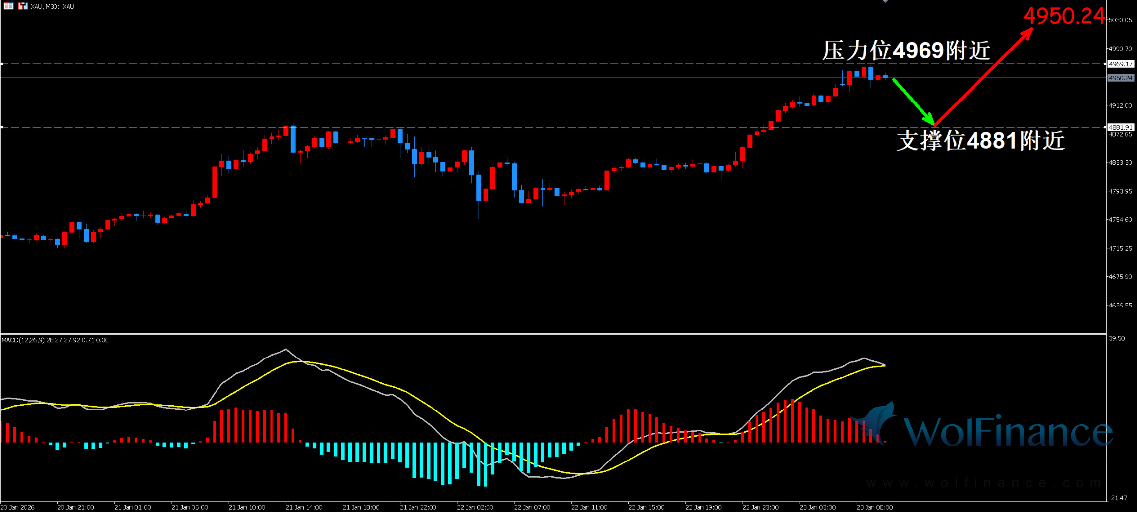 1. 黄金技术图表显示目前K线支撑位4881附近