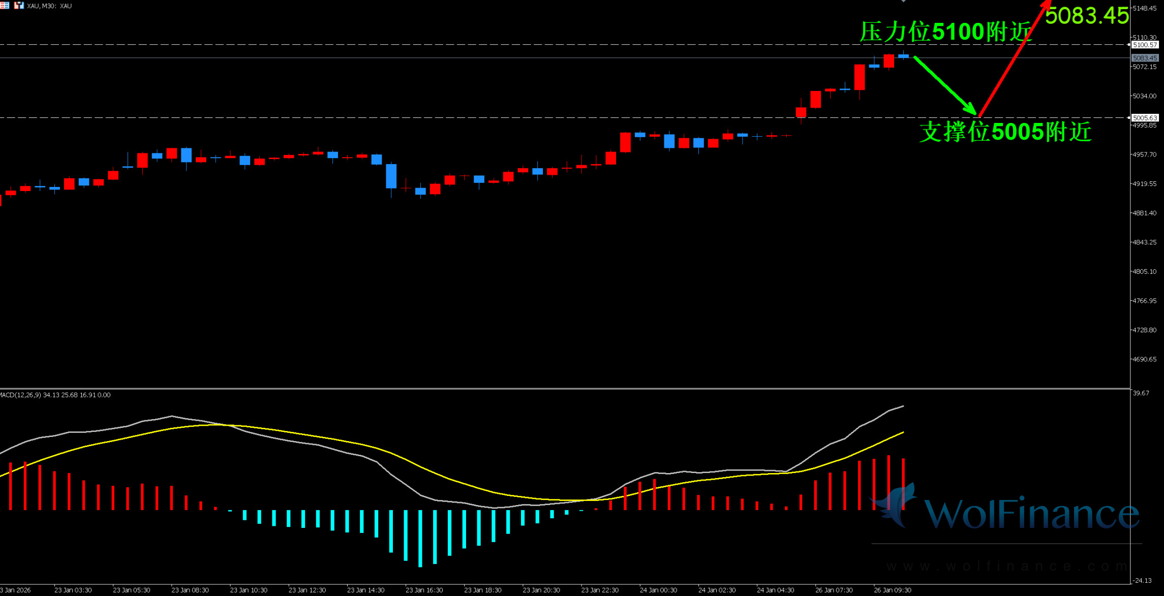 1. 黄金技术图表显示目前K线支撑位5005附近