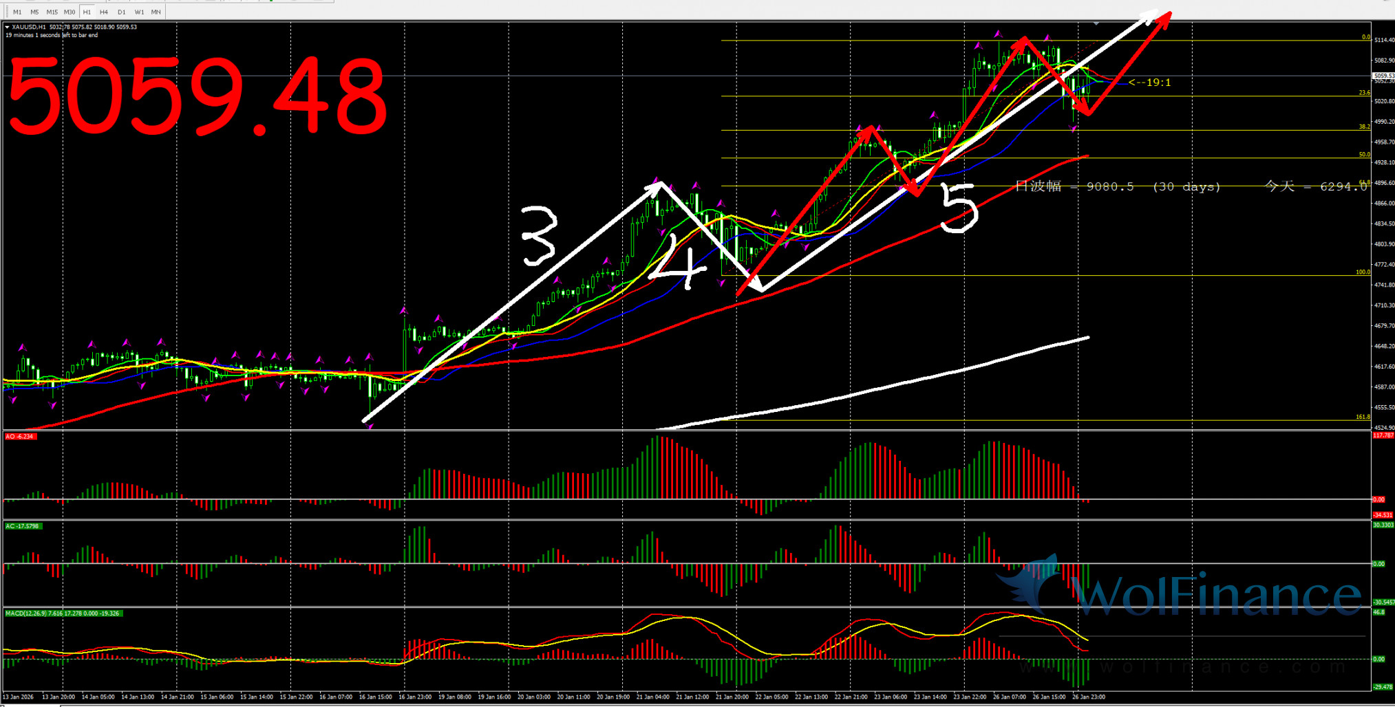 日线级别行情处于3浪行情,关注3浪行情走势,在日线图中关注压力倾向在日线图5131-33一线附近;支撑倾向在日线图50%(4564);61.8%(4430);四小时行情处于3浪状态,关注3浪的行情走势。支撑倾向在4630附近。1小时图AO零轴下红色,AC零轴下绿色,代表在小时图中,行情倾向隔夜小时图处在5浪行情,目前在小时图中关注5-4浪的行情走势,下方支撑4630附近。在1小时图中,行情上涨压力关注5131-33附近。