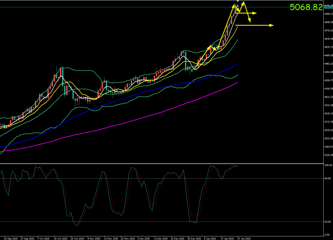 现货黄金周一(1月26日)上演了史诗级的突破与剧烈震荡。金价在亚欧盘时段强势上攻,盘中历史性突破5000美元/盎司这一重大心理关口,并进一步拉升,最高触及5111.11美元/盎司的新高。然而,创新高后市场出现显著获利了结,价格自高位快速回落。最终收盘于5008.35美元/盎司附近,日线收出带极长上影线的阳线,单日波幅巨大,明确显示了在突破关键整数关口后多空分歧的加剧。