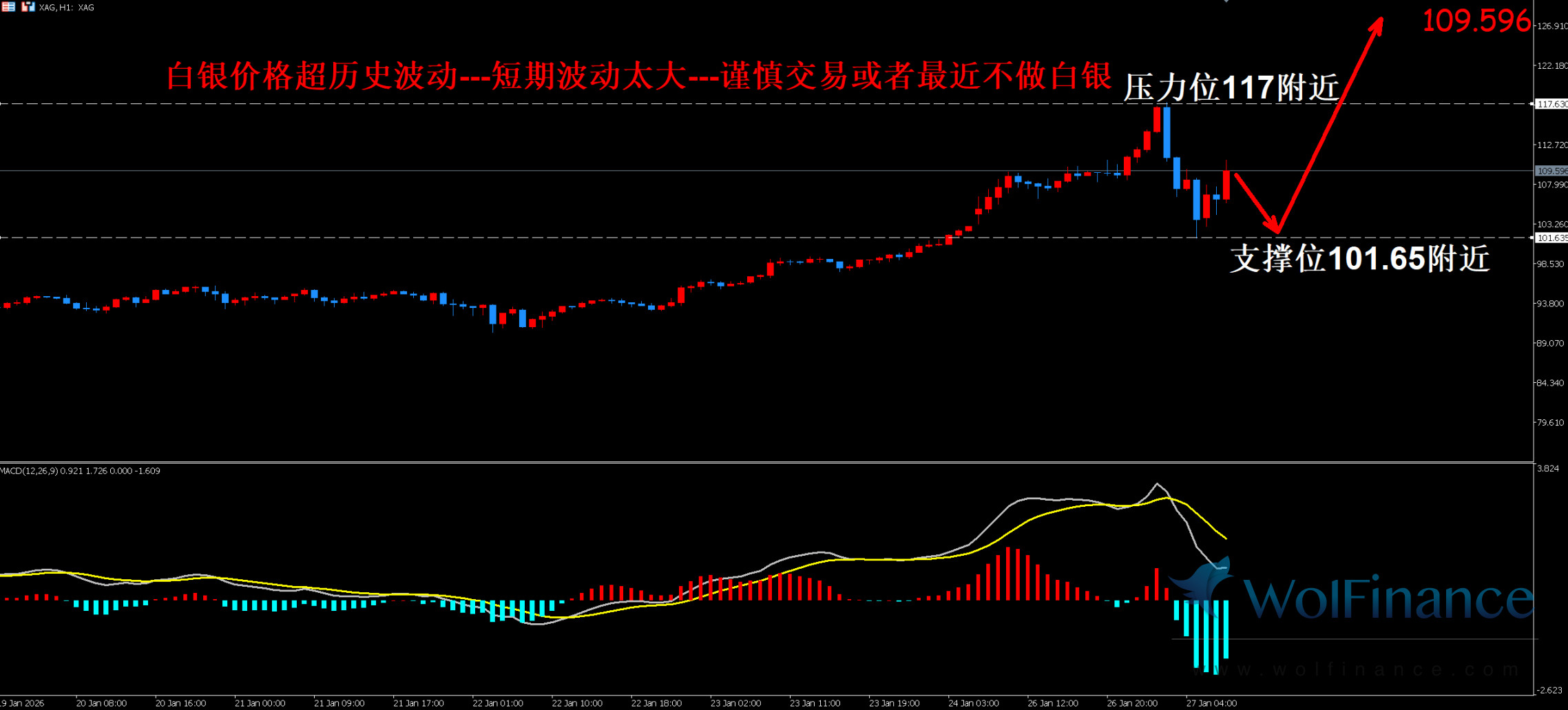 1. 白银技术图表显示目前K线支撑位101.65附近,大趋势看涨,目前盘整为主要MACD亚盘方向。市场活跃 度减弱,交易需要谨慎并且可参考低位多单轻仓操作。